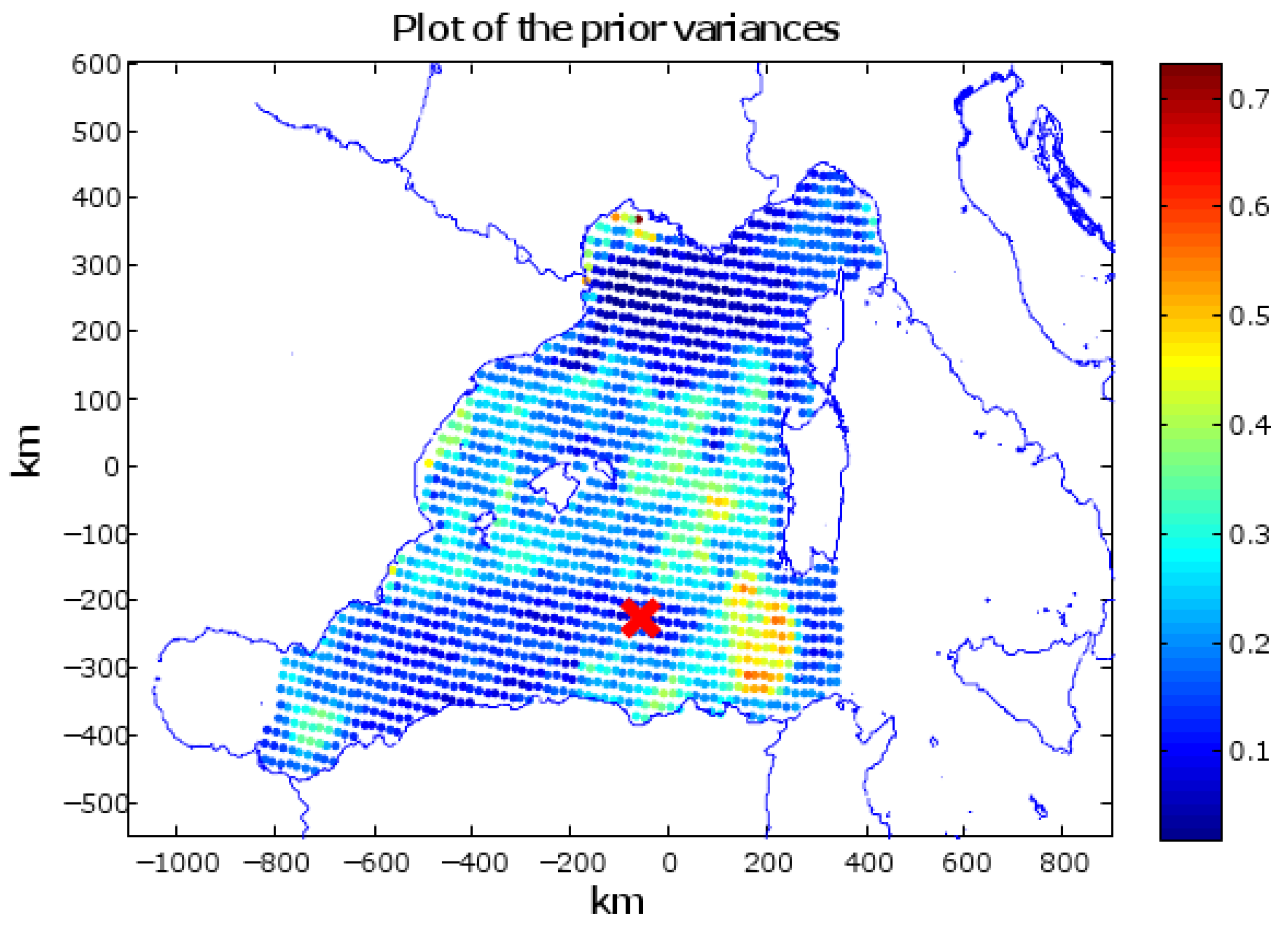 scenario 2 threshold values are equal to 70% of the relative prior variance values throughout the operation area except that in a circular area with a 230 km radius centered west of Sardinia where the threshold values are equal to 50% of the relative priors (see