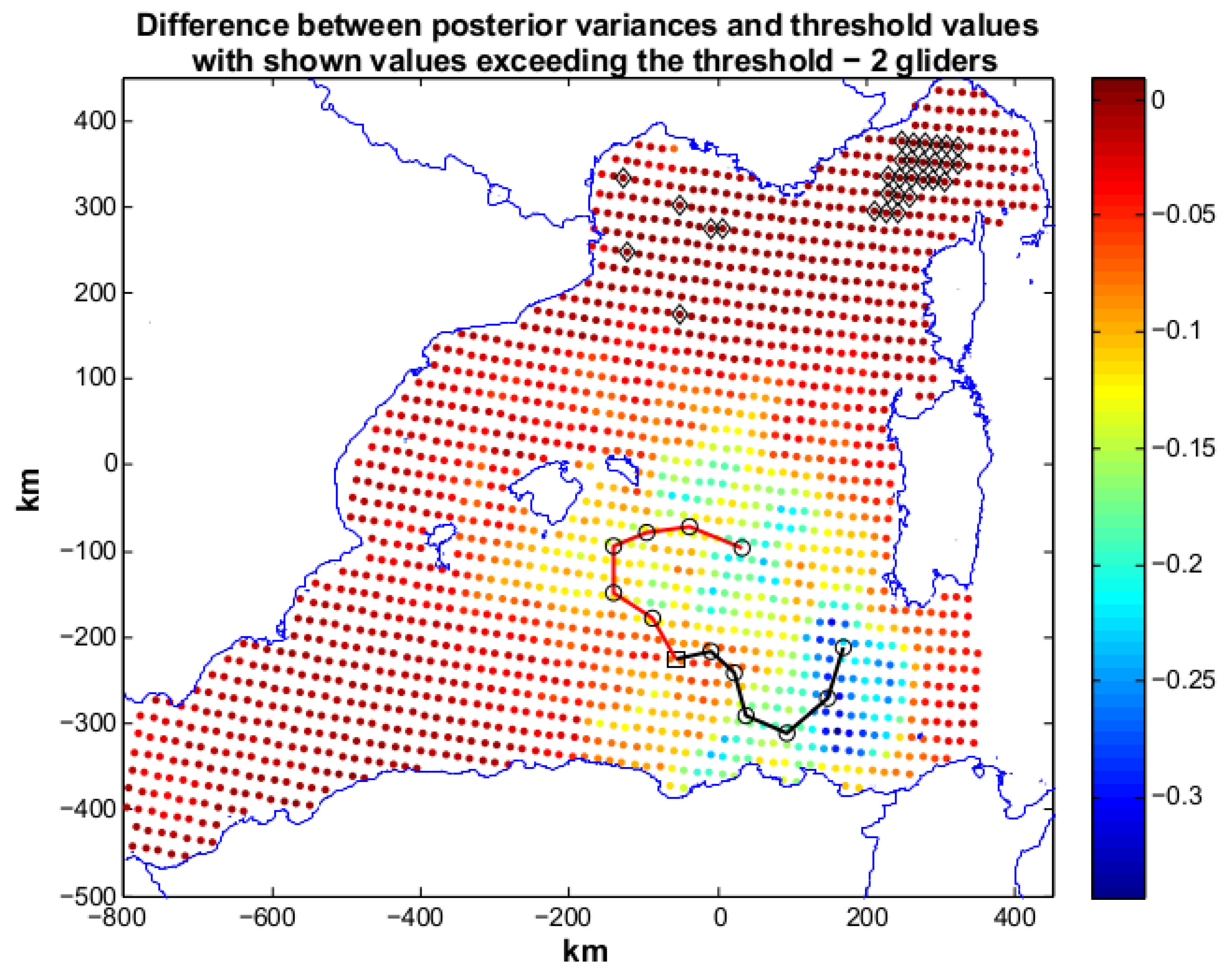 Scenario 1: planned paths for two gliders. The solution is characterized by and . In the figure we show also the difference between posterior variances and relative values of the objective threshold. Black markers toward the north-east part of the operation area indicate locations whose posterior was not lowered enough. These locations are limited in number proving the optimization produced a solution close to the optimum.