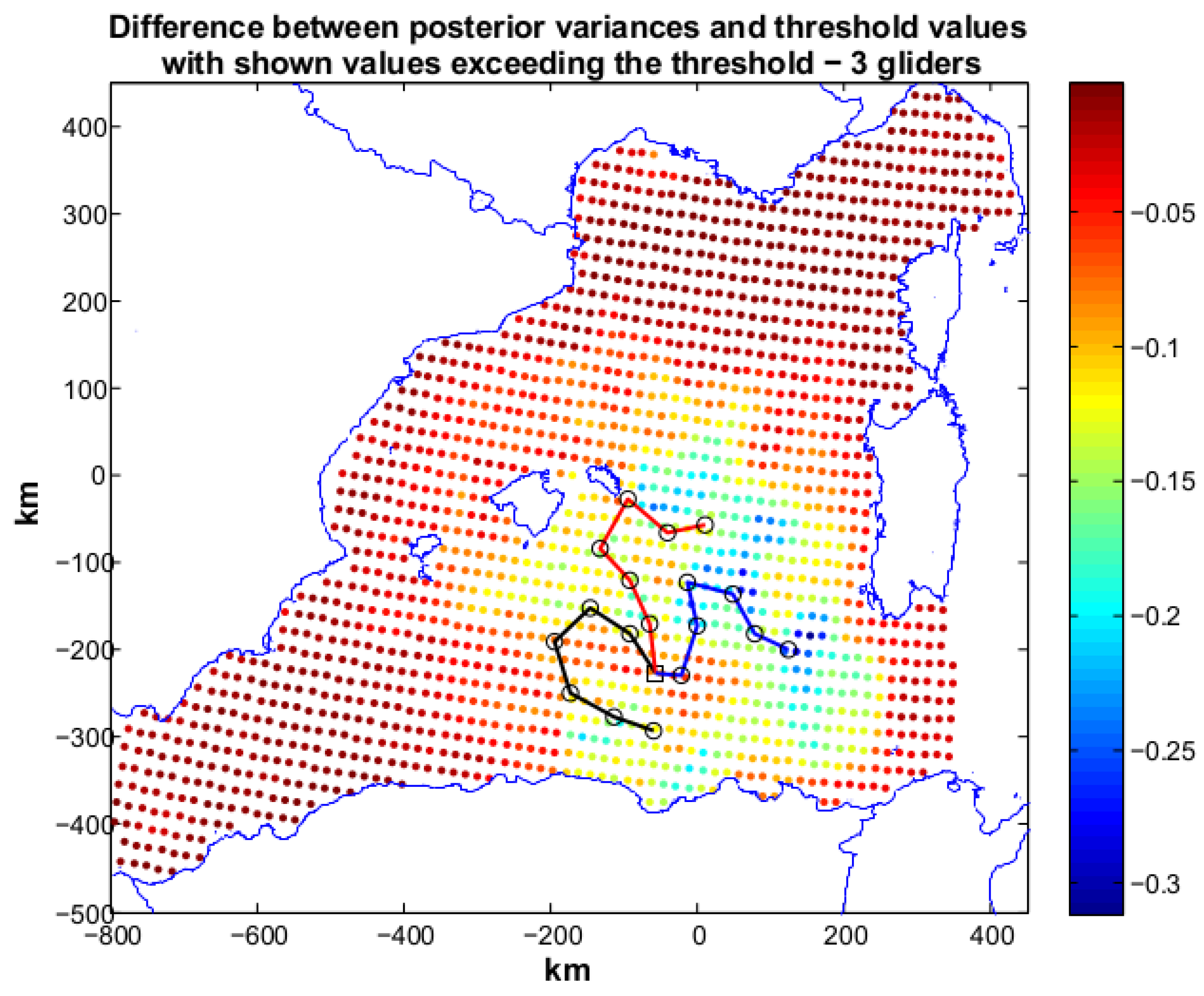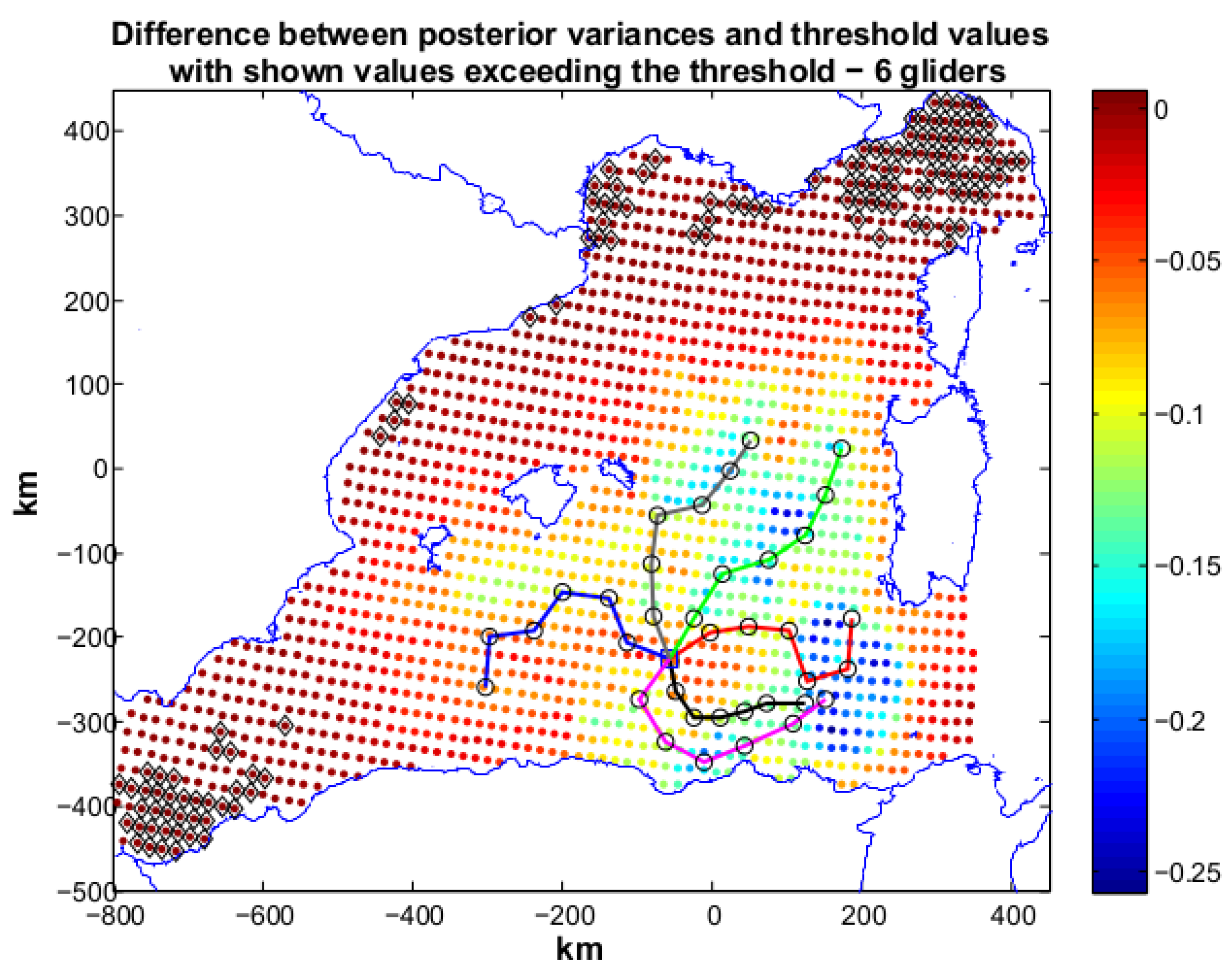 6 gliders succeeded in lowering the posterior even if some areas in the north-east and south-west corners could not be influenced as we required. This is due to the distance of these areas from the glider paths and to the requested low value of posterior. In this scenario, the solution with six gliders results as the only reasonable candidate to provide a good solution to our problem.