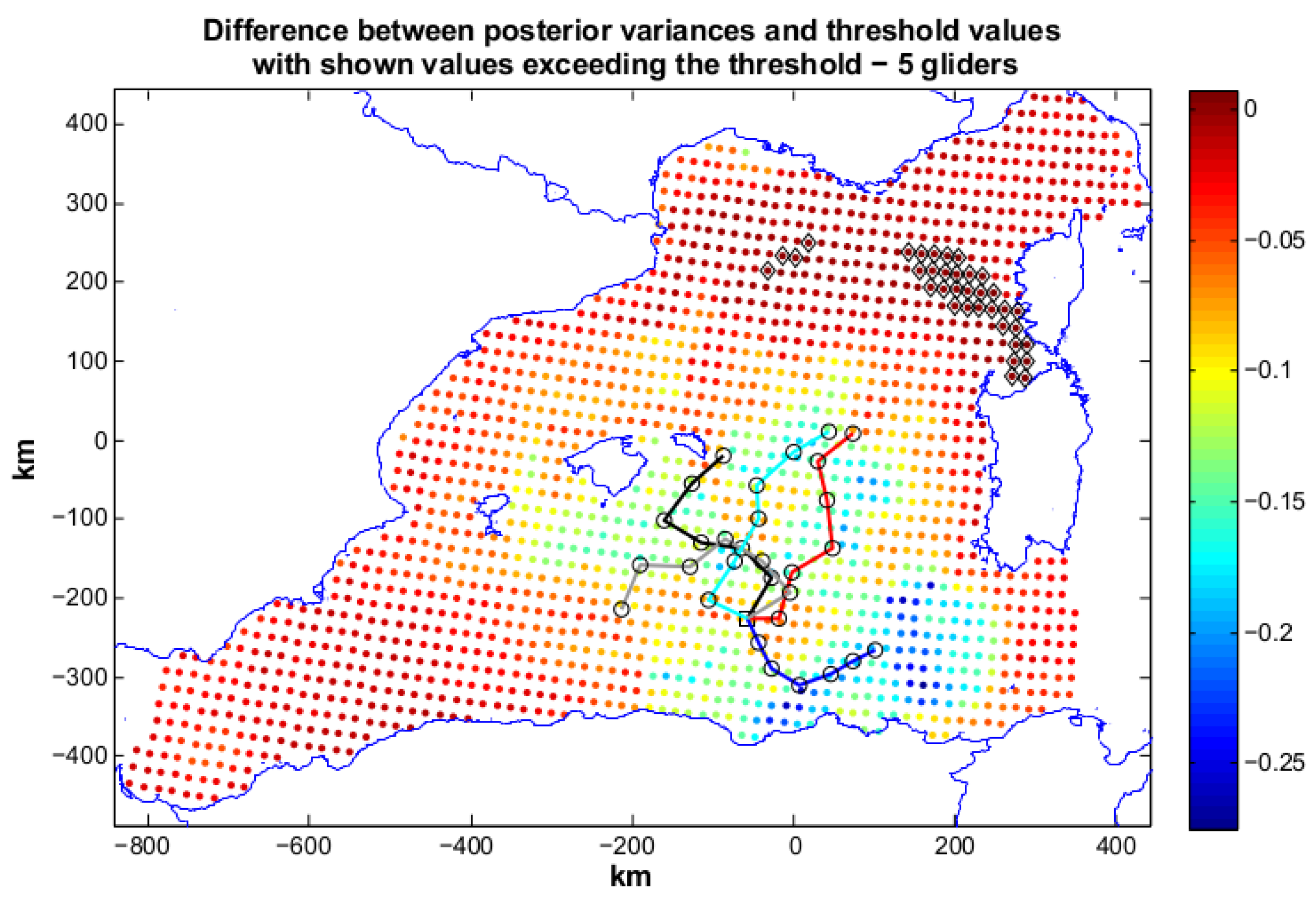 Scenario 3: planned paths for five gliders. The solution is characterized by (). In the figure we show also the difference between posterior variances and relative values of the objective threshold. The high number of black markers toward the north-east and south-west parts of the operative area indicates posteriors for which gliders did not succeed in reducing enough failing to meet the target variance. More samplings (gliders) are therefore needed.