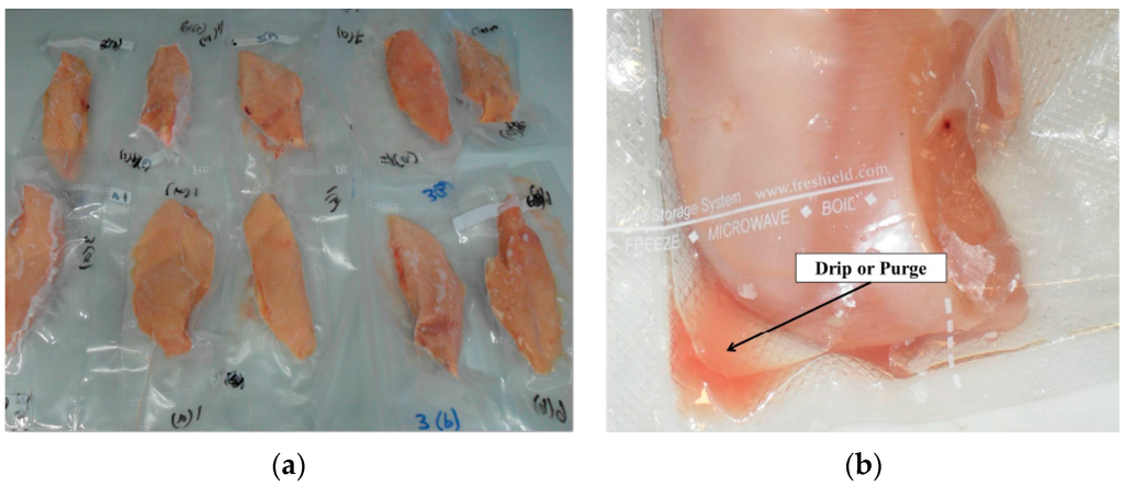 Studied broiler breast fillets. (a) Samples stored in freezer; (b) Equilibrated sample with collected drip.