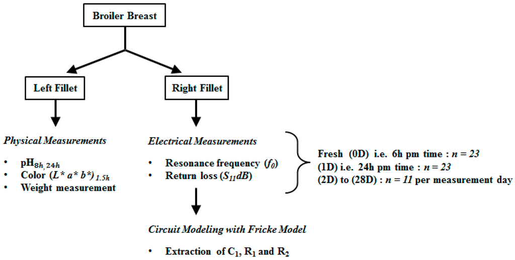 Fresh broiler carcasses were collected from the local supplier at 45 min postmortem time and then immediately transported to the laboratory in an ice-filled box. Breast fillets (pectoralis major) from the right half of the carcass were excised and their weight was measured with weighing scale (Ohaus, Valor Precision 3000, New York, NY, USA). The left half of the breast remained intact with the carcass for the physical analysis. All samples were then vacuum packed by using a vacuum sealer (Fresheild, Elite III, Malaysia) and then stored at a chilling temperature at 4 °C (Figure 5a). Subsequent measurements were performed after 0, 1, 2, 7, 14, 21 and 28 days. On each measurement day, samples were taken out of the refrigerator and allowed to equilibrate at room temperature for 3 to 4 h, as reported elsewhere [9]. The cubic samples (30 × 35 × 15 mm, approximately) were obtained by trimming the fillet by using a sharp cutter. Special care was taken to extract samples of similar size, considering the material density influence on measurements [23]; however, due to its malleable nature a minor variation was found in size, which was negligible [24]. Since ageing can affect the anisotropy of muscles [25], dielectric measurements were taken both parallel and perpendicular to the fiber direction.