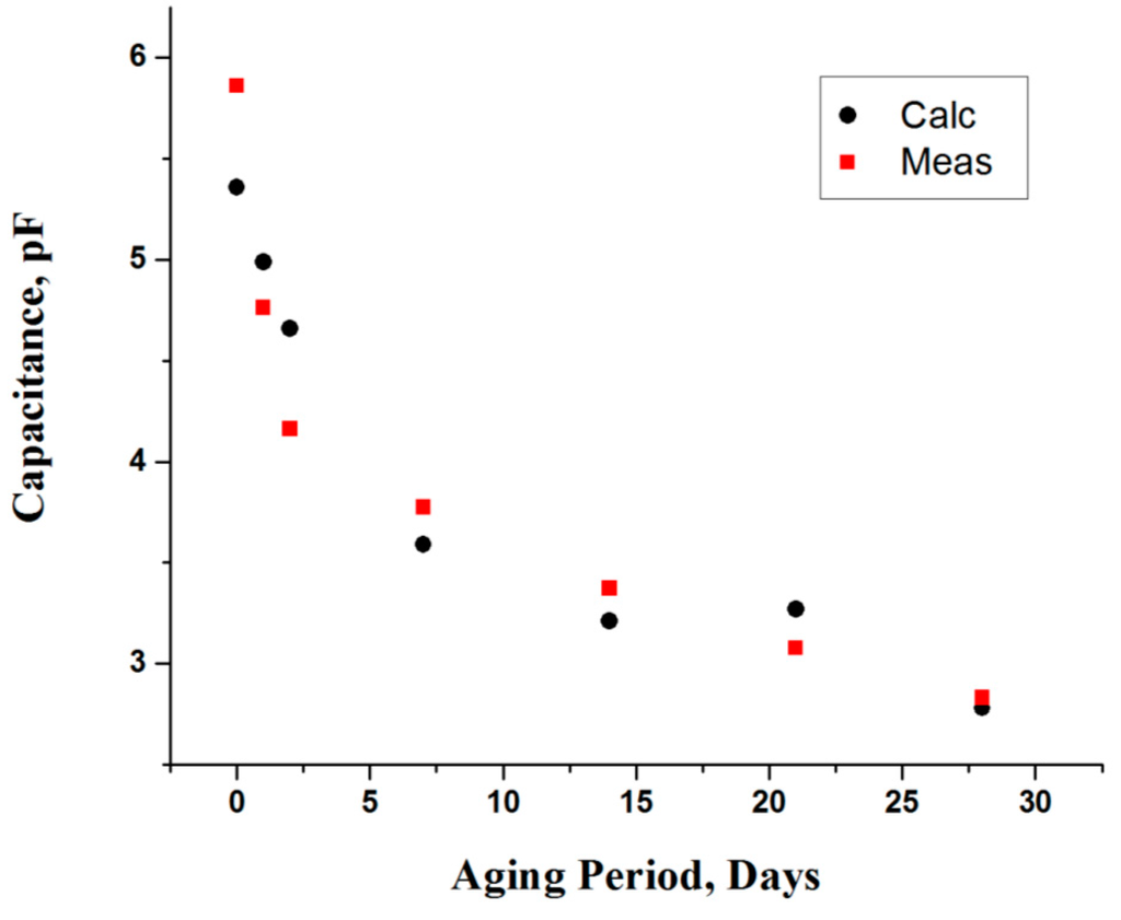 Meat equivalent circuit parameters are calculated from fittings of the resonance frequency and return loss plots to the Fricke model. The cellular membrane, which is characterized as capacitance (C1), deteriorated over the time period. This can be observed in Figure 9, which shows a decrease in capacitance relative to the storage time period [4]. The insulating properties of the cell-membrane decrease with the aging period, due to oxidation of phospholipid membrane layers, which makes it permeable [11]. Moreover, the capacitance of membrane was decreases rapidly, about a 30% change in the early aging (0D–7D) period, which shows the significant structural changes in that period.