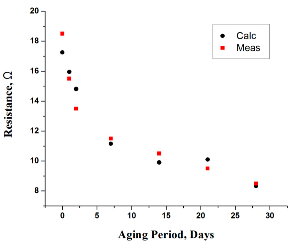 As depicted in Figure 11, the calculated values for the extracellular resistance (R2) using Equation (13) are in good agreement with measured values, where the overall difference is minimal. Finally, it is deduced that the obtained empirical models for the C1, R1 and R2 can be used to define the relationship between aging and electrical parameters for the aging period (0D–28D) with other considered parameters.
