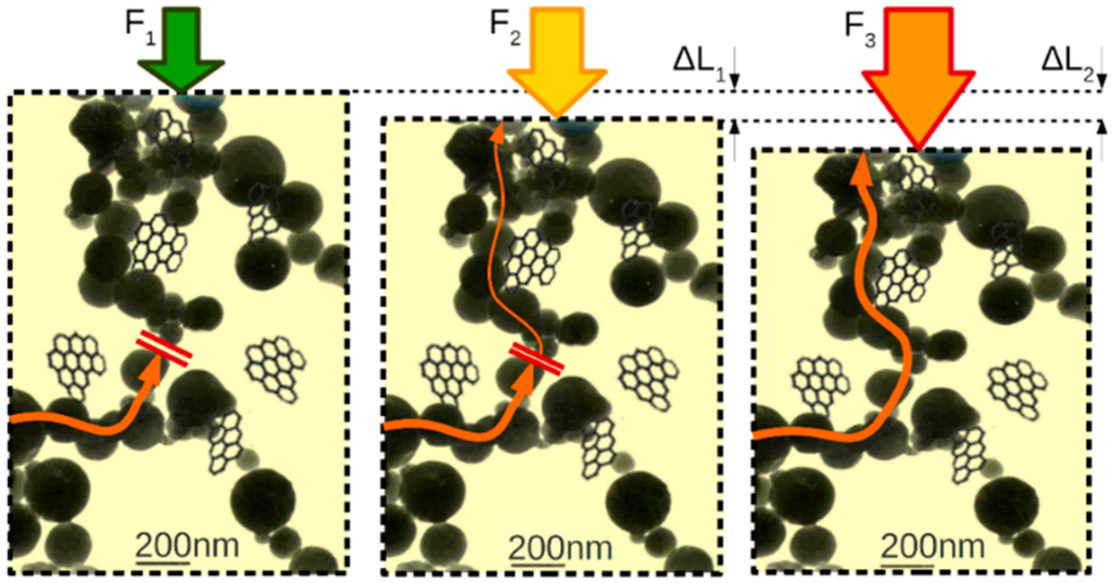 Cartoon drawing depicting three states of conductive chain, changing due to elastic deformation of the structure: (left) No conductance; (middle) Tunneling barrier, partial conductance; (right) Contact and full conductance. Similar process of barrier thinning occurs with the increase of the temperature. Graphene nanoplatelets not to scale.