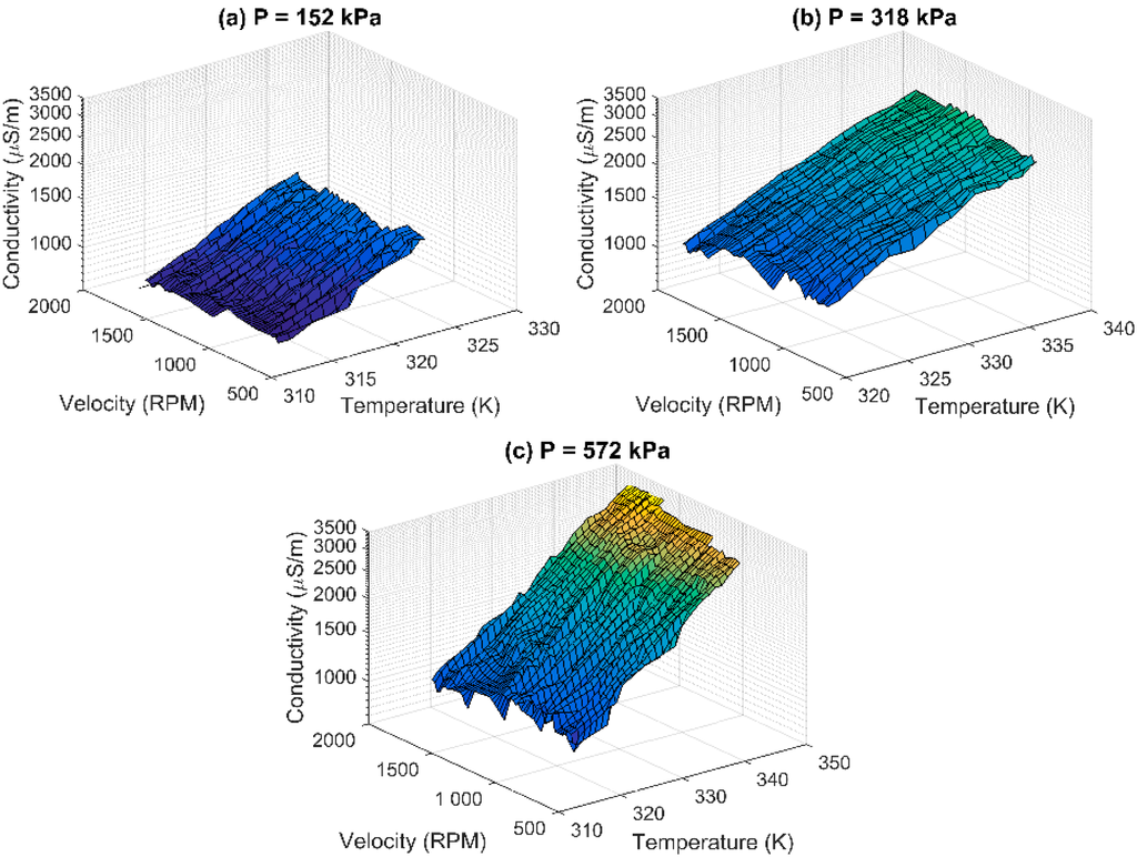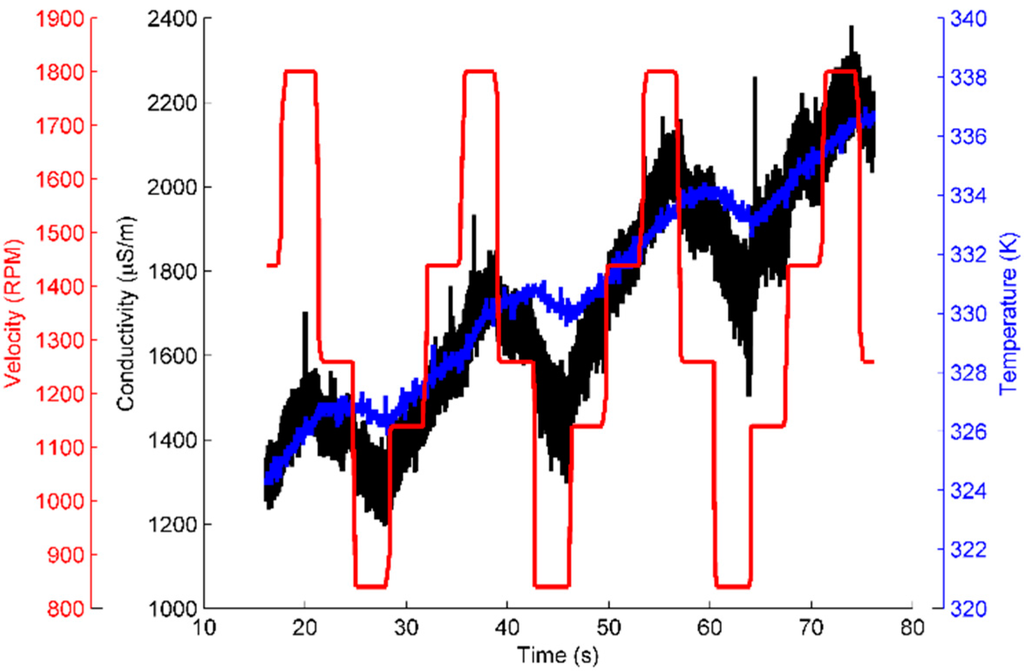 Figure 2 shows a strong correlation between conductivity, temperature and rotational velocity (which changes the tangential force caused by the friction): as the temperature rises, the conductivity rises. The relationship between the conductivity and rotational velocity can be most clearly seen for times from 65 to 75 s, where the conductance clearly changes in a step-like fashion, as the rotational velocity is. It should be noted that the conductivity changes lead changes in the temperature, which is due to temperature having a slower response time caused by the heat capacity of the material.