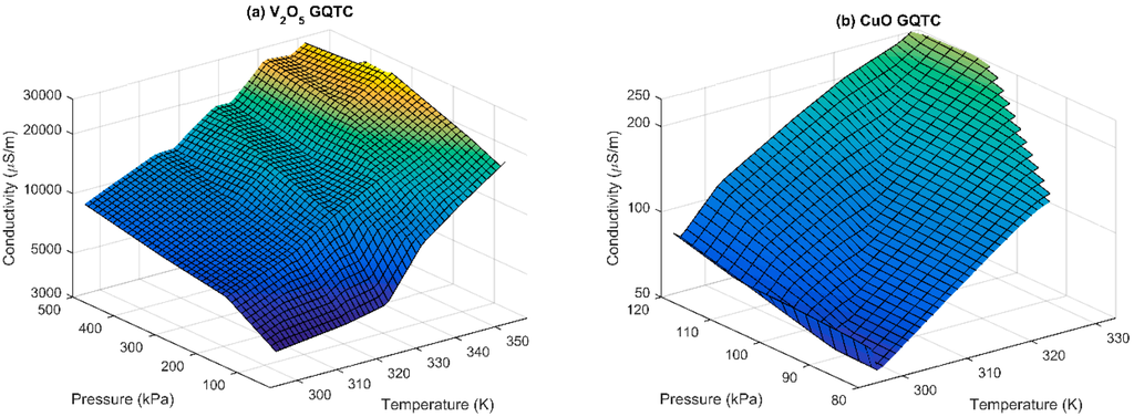 This model is based on observation that the nonlinearity of the conductivity space σ can be expressed as a logarithmic series, and all the measured parameters p are approximated by a Taylor series. It should be noted that both models described by Equations (5) and (6) can be rewritten to be special cases or this generalized mode. In order to approximate the material’s conductance space σ(P,v,T) of CuO and V2O5 GQTC sets M = 3, N = 1 and s = 1, thus takes a form: