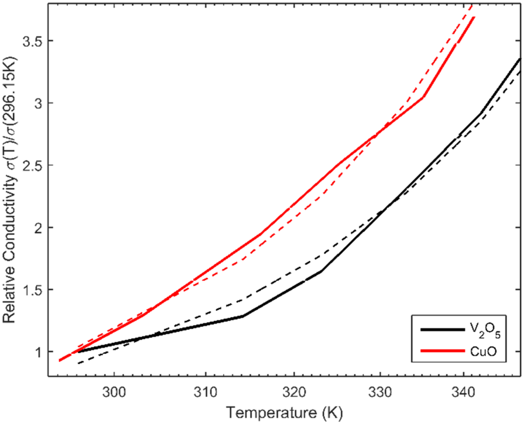 From the sensory perspective, both materials exhibit very good sensitivity, with the relative conductivity increasing ~3.5 fold over the change in temperature of ~50 K (Figure 5).