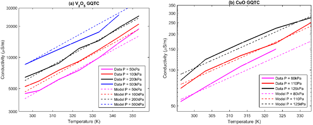 Observed (measured) conductivity σ(P,T) of (a) V2O5; and (b) CuO GQTC for static measurements.