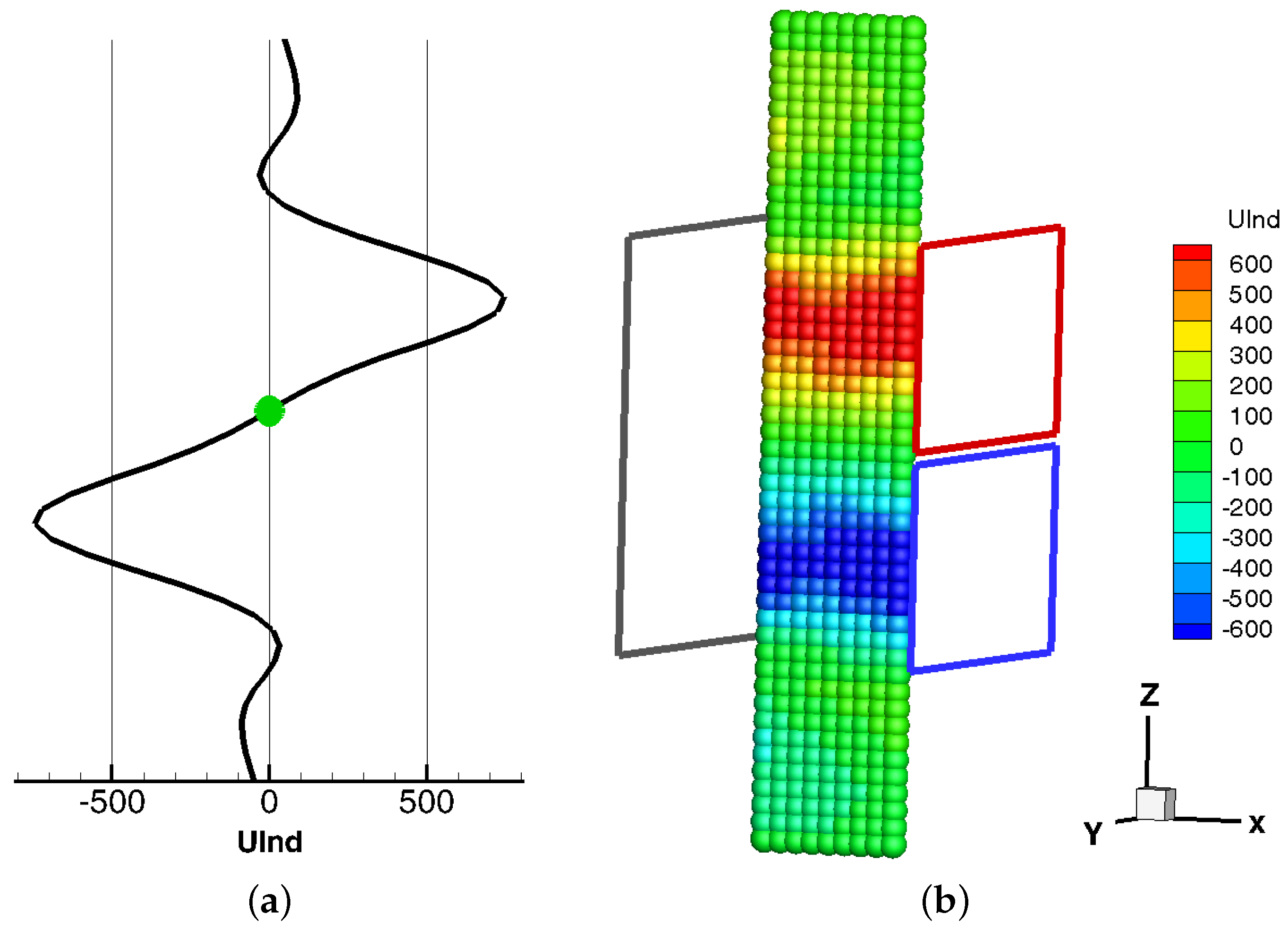 Induced voltage (UInd) of the 2D-model in arbitrary units for a bubble in the channel traveling over z. (a) The signal of the gradiometer for one bubble at the center of the channel; (b) The color of each bubble in the central plane of the sensor represents its induced voltage in the gradiometer.