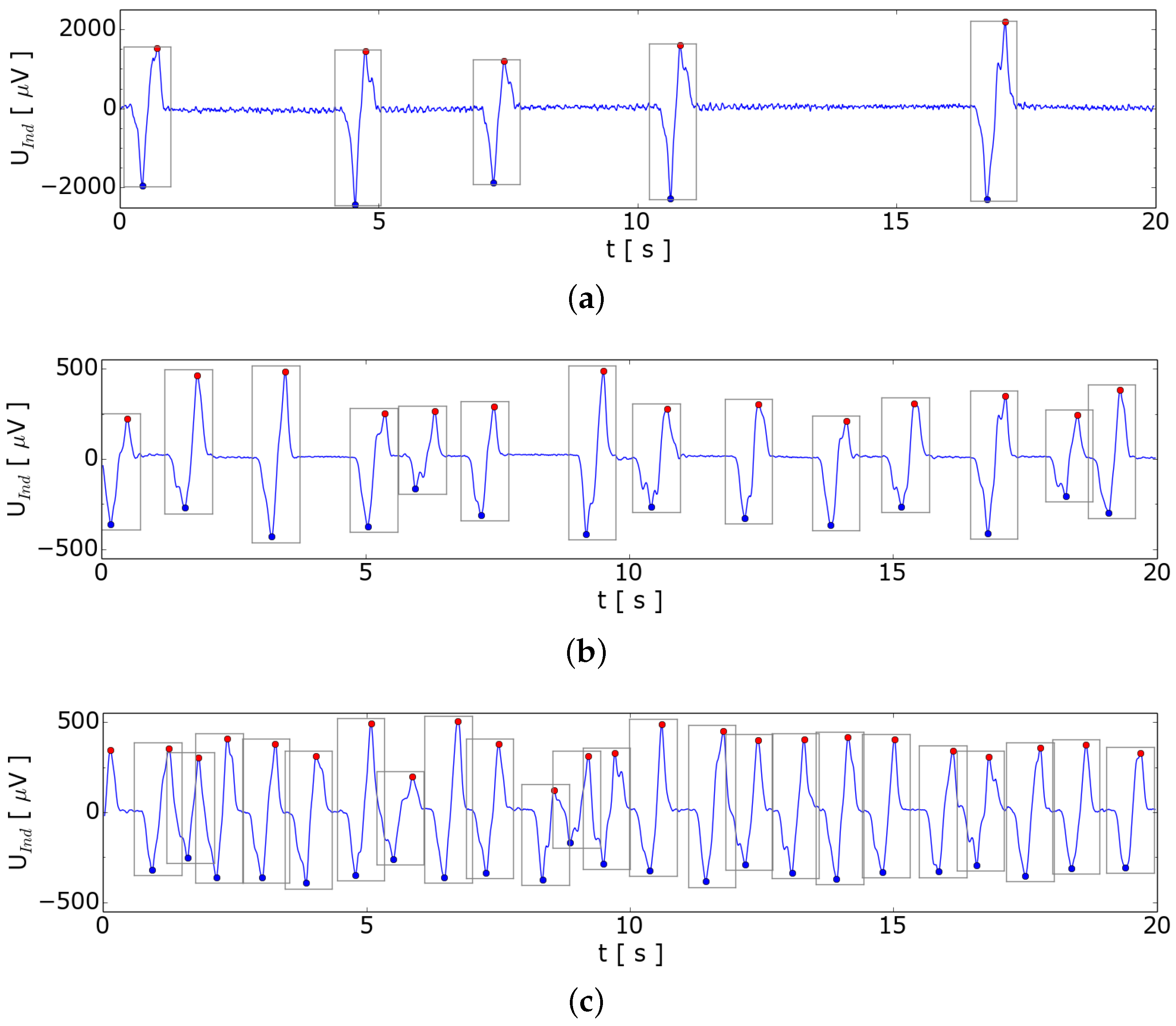 Demodulated signal from argon bubbles rising in the GaInSn column with automatic bubble detection. The bubbles are marked by rectangles; (a) Induced signal at 5.2 sccm argon with an average bubble diameter of 8.7 mm; (b) Induced signal at 5.6 sccm argon with an average bubble diameter of 6.3 mm; (c) Induced signal at 6.3 sccm argon with an average bubble diameter of 5.6 mm.