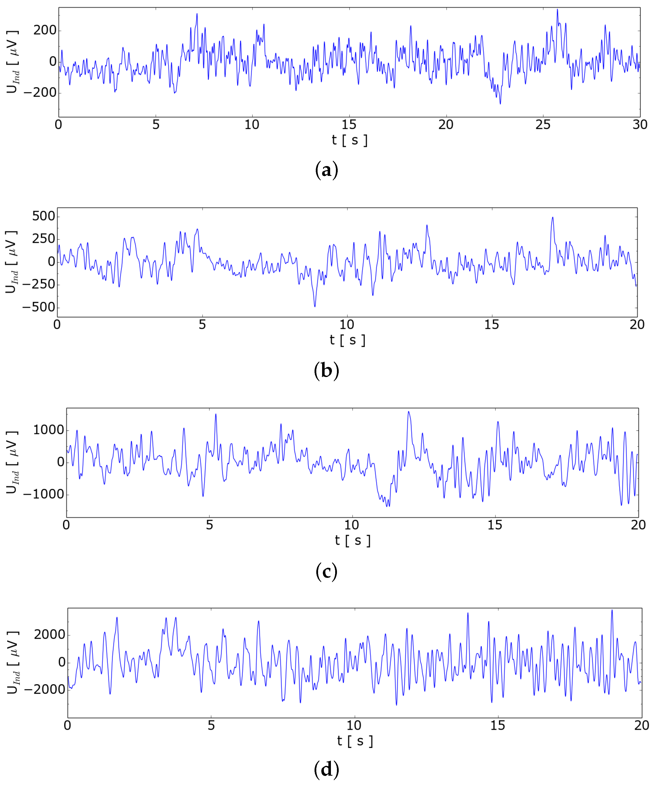 Induced voltage for void fraction analysis. (a) 14 sccm—SDEV = 93 μV; (b) 22 sccm—SDEV = 154 μV; (c) 56 sccm—SDEV = 516 μV; (d) 97 sccm—SDEV = 1336 μV.