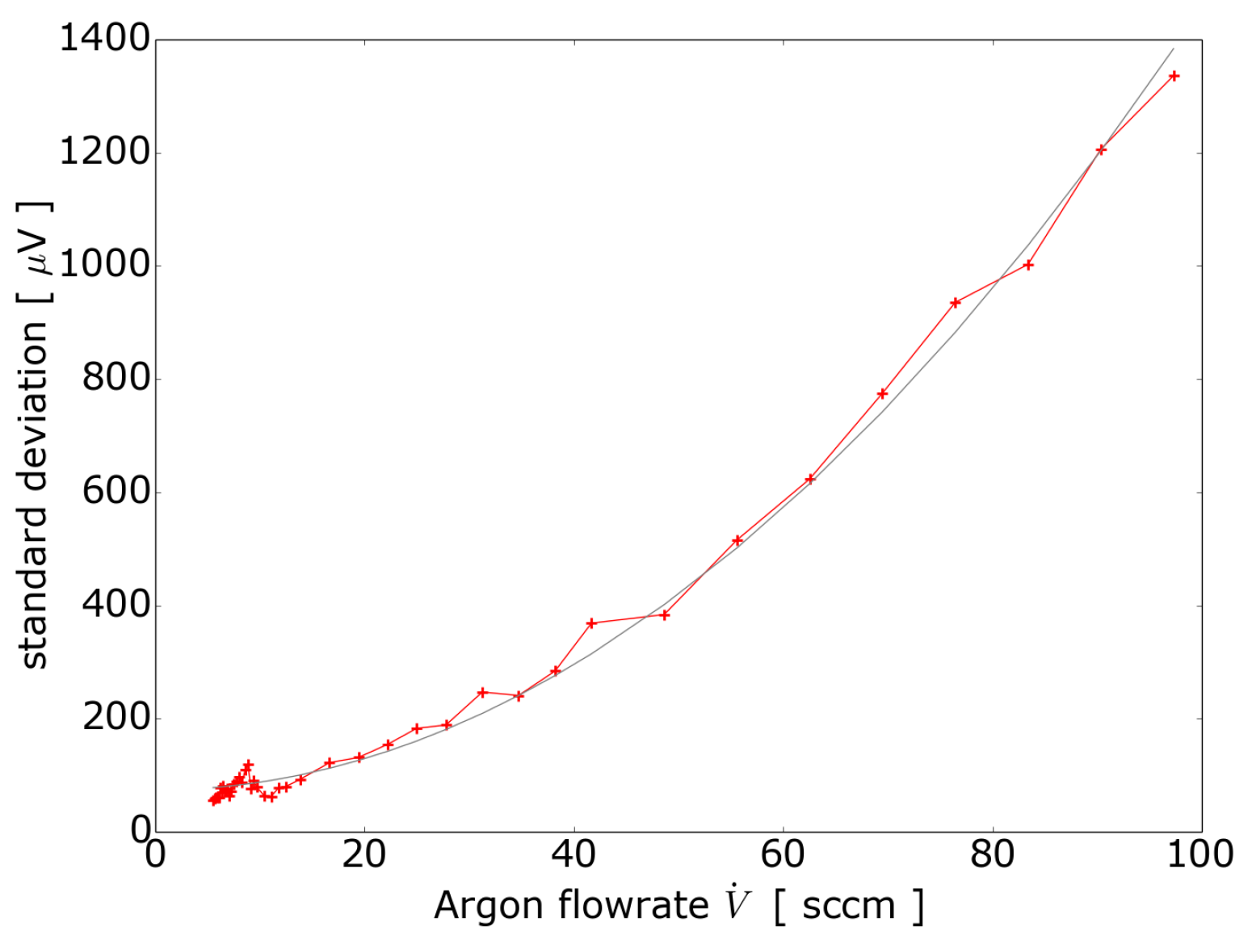 Quadratic dependence of the standard deviation of the induced voltage with the argon flow rate. The red line are the measurements and the grey line is a quadratic fit to the measurement data.