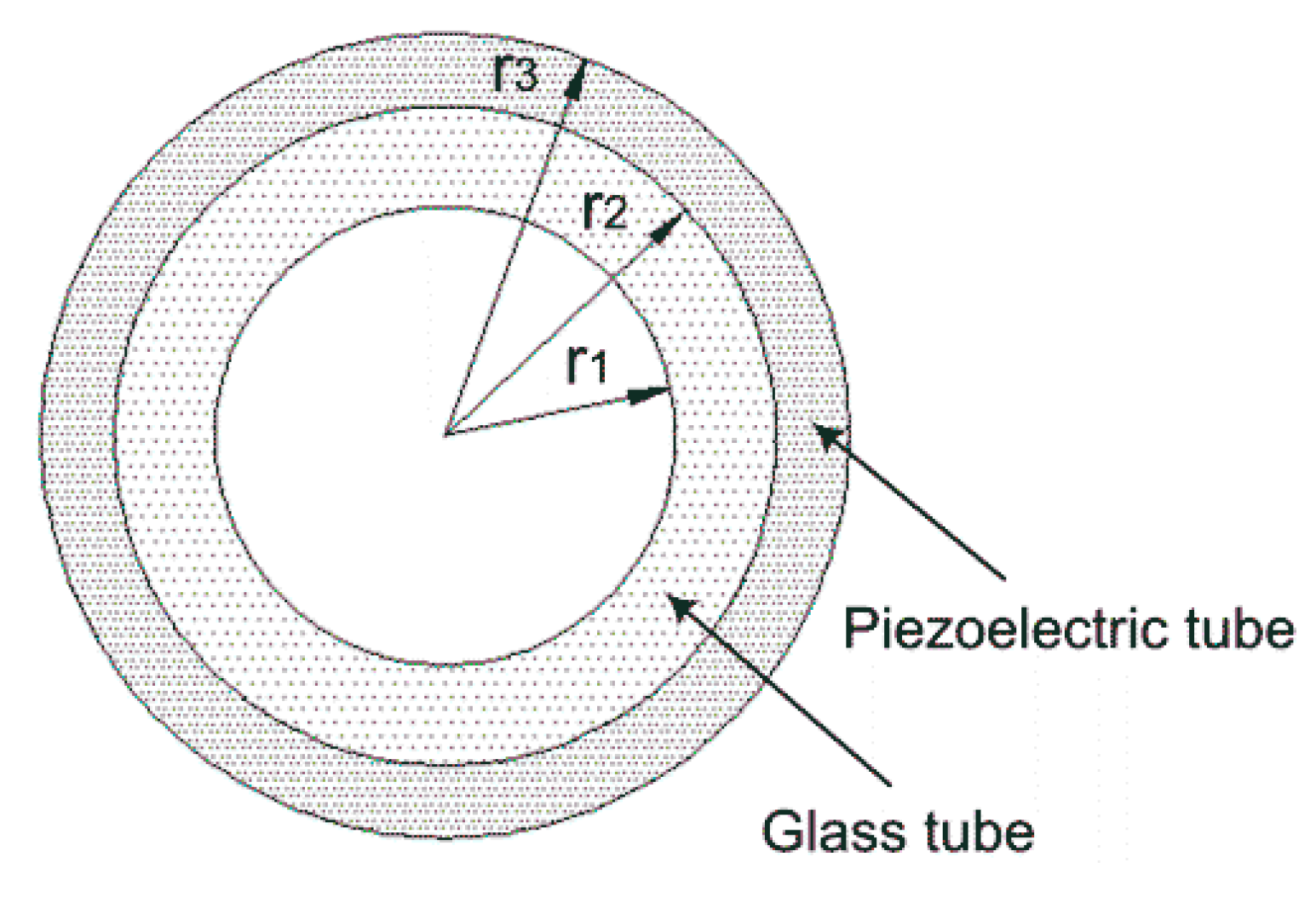 The stress on the inner surface of the piezoelectric tube, represented as P 2 , is outward because of the deformation resistance from the glass tube. Then,