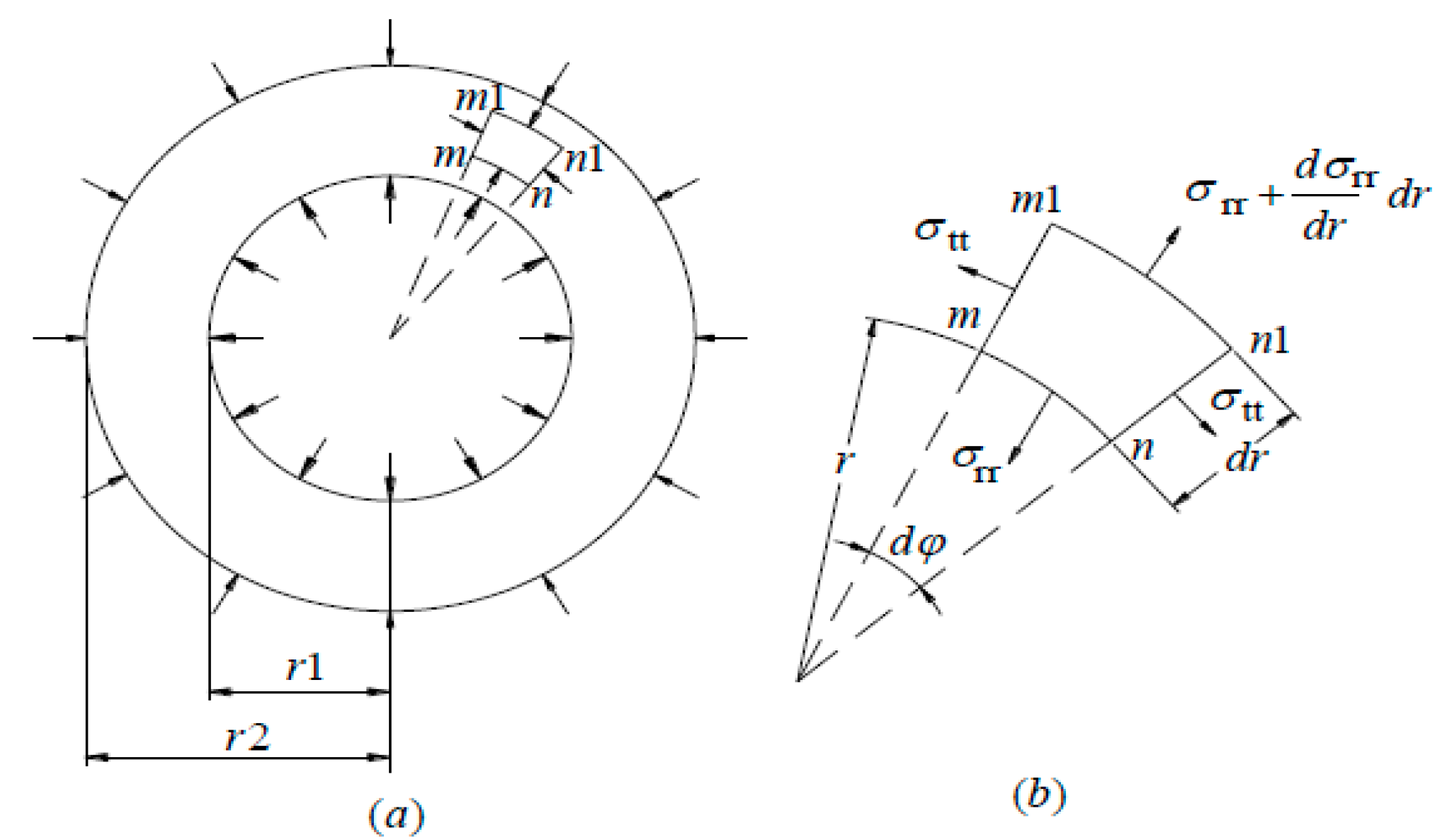 To simplify the analysis, the glass tube is viewed as an isotropic material. This is suitable in deformation analysis. Timoshenko described the steady state force equation of an isotropic thick-wall hollow cylinder in Reference [19], and the force diagram is depicted in Figure 3. The following analysis quotes the equations in Reference [19] directly.