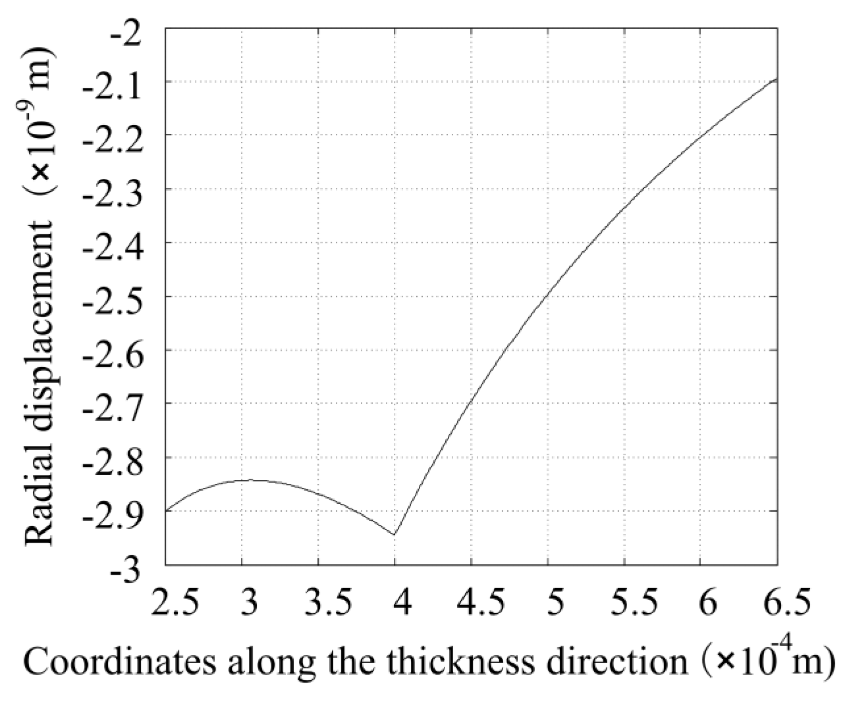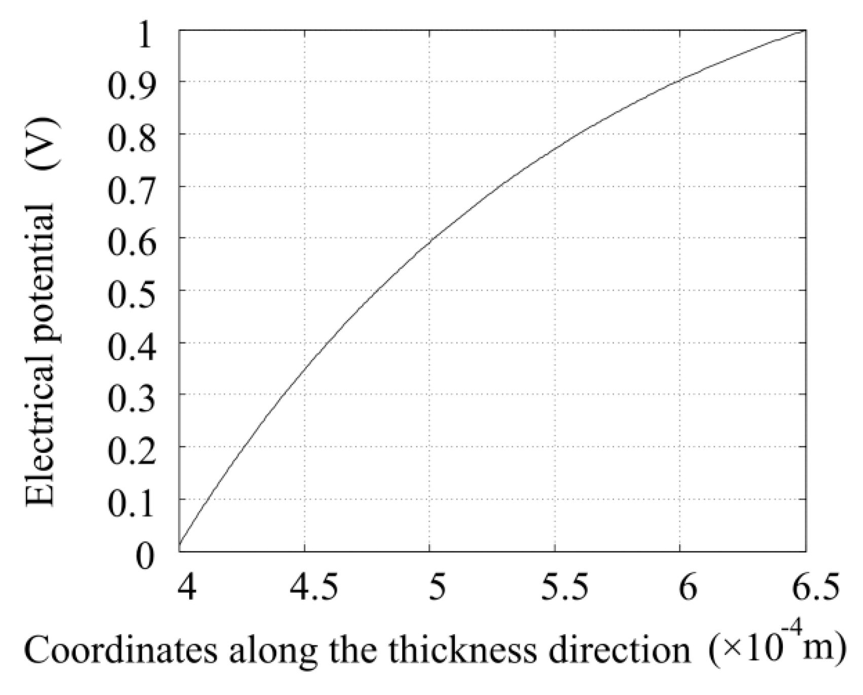 Making use of Equation (10), the electric potential distribution along the radial direction is obtained. As shown in Figure 7, the electric potential is not linearly distributed along the thickness direction.
