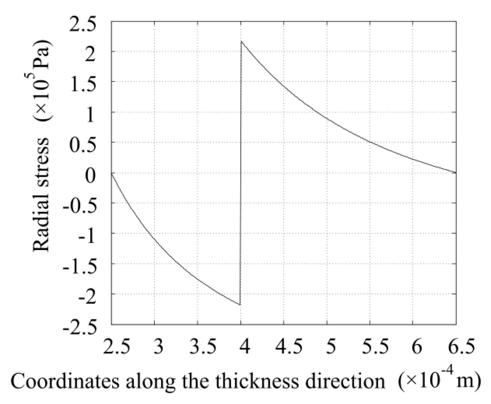Figure 5. Radial stress distribution along the thickness direction when the voltage amplitude is 1 V.
