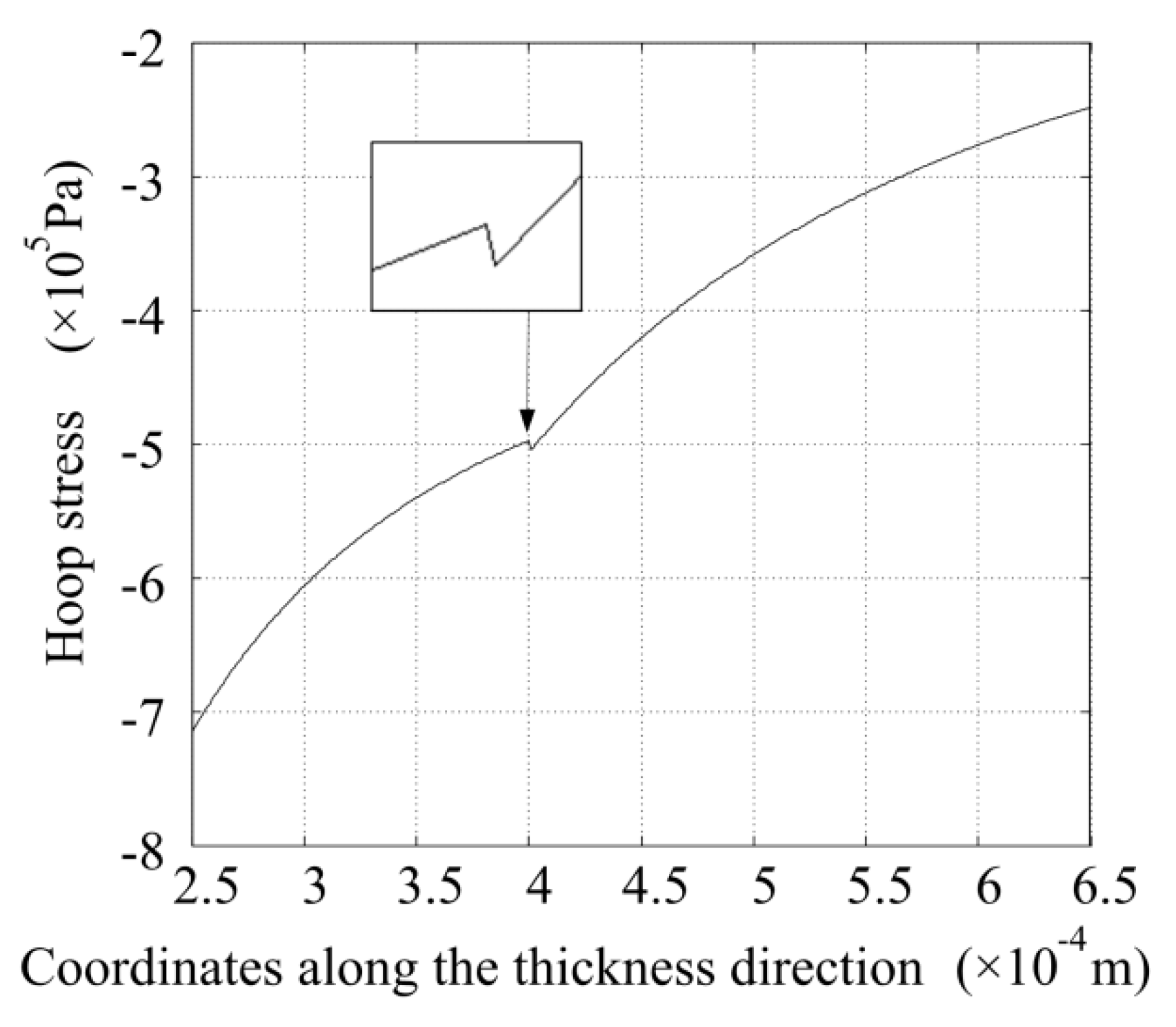 Utilizing Equations (3) and (23), the hoop stress distribution along the thickness direction is obtained and is shown in Figure 6. The hoop stresses in the glass and piezoelectric tubes are all negative. This means that the particles in the tubes in the circumferential direction are all compressed. The hoop stress increases as the radius decreases and reaches the maximum at the inner surface of the glass tube. The hoop stress is not continuous at the place where the two tubes adhere together, which conforms to physical truth. In Figure 6 it can be found that the hoop stress is generally larger than the radial stress.