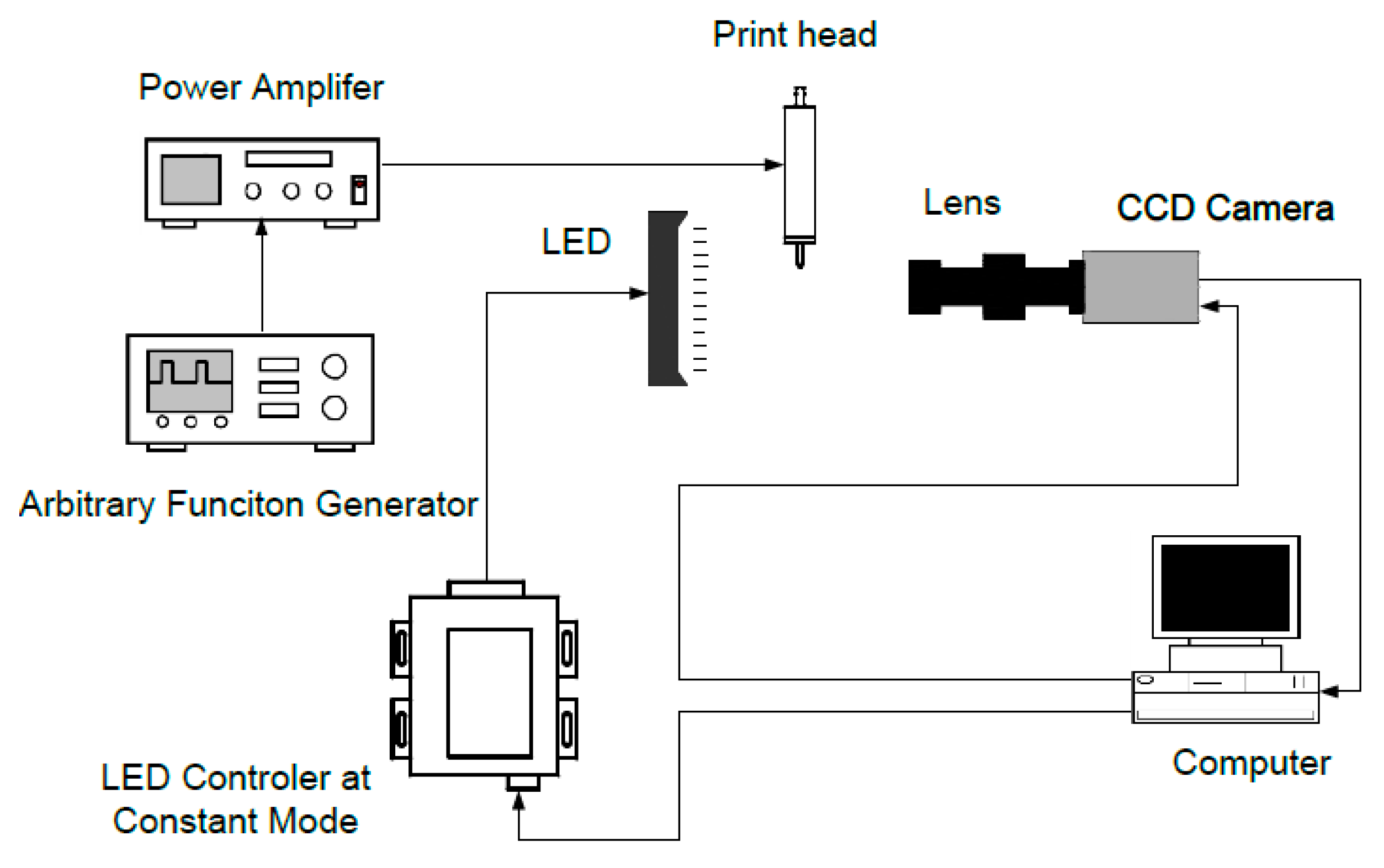 The platform is shown in Figure 8. A step voltage signal was generated by a signal generator (Agilent 33220A, Santa Clara, CA, USA) and was amplified by a voltage amplifier. Then, it was fed to the print head. Together with a high-speed voltage output device (PCIE 6711, National Instrument, Austin, TX, USA), the computer can generate a signal with a sampling frequency of up to 1 MHz. The generated pulses were used to trigger a CCD camera (scA780-54fm/fc, Basler, Ahrensburg, Germany). A LED controller (S4000, Advanced Illumination, Rochester, MN, USA) was used to set the LED at continuous illuminating mode because the drop adhering to the nozzle is static. A lens (Moritex-ML-Z07545, Saitama, Japan) was used to properly magnify the image. The acquired image was transported to the computer for analysis through an image acquisition device (PCI-1405, National Instrument, Austin, TX, USA).