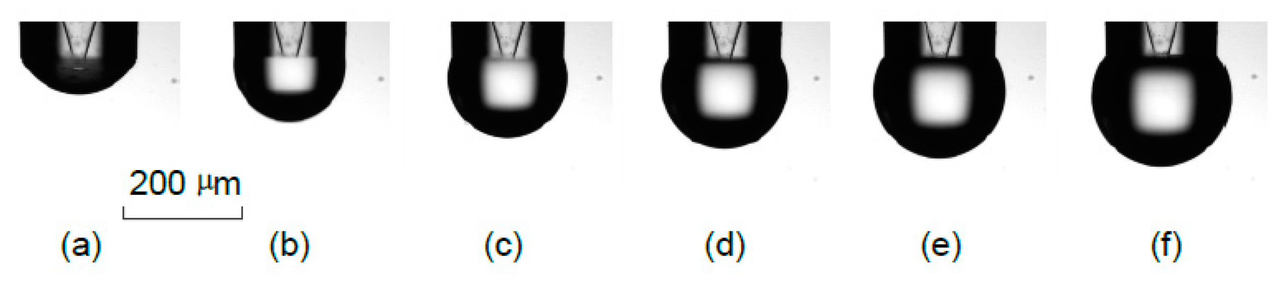 Next, the bottom cap of the print head was unsealed. Through the imaging system, the print head tip was wetted with a small amount of water, as shown in Figure 9a. After the feed of voltages of 20 V, 40 V, 60 V, 80 V, 100 V, respectively, and owing to the deformation of the tubes in the print head, small amounts of water were squeezed out of the print head and imaged by the imaging system as shown in Figure 9b–f, respectively. These images were taken two seconds apart in time.
