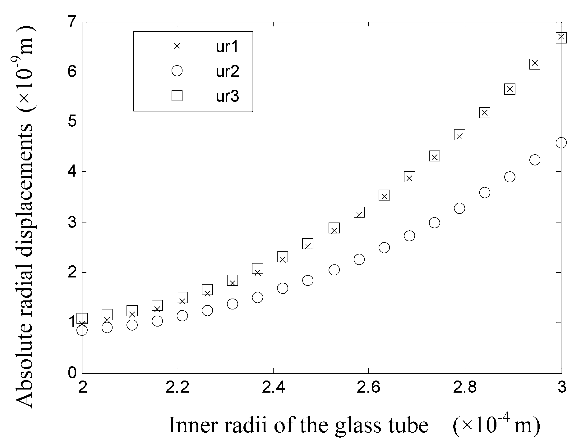 To study the influence of tube wall thickness on the deformation and stress statuses, it is essential to investigate the displacement field when the radius of each tube is changed. As shown in Figure 11, when only the inner radius of the glass tube is changed, the wall displacements would change significantly. The symbols u r 1 , u r 2 , and u r 3 in Figure 11 refer to the displacements at the surfaces with a radius of r = r 1 , r = r 2 , and r = r 3 respectively. In addition, it is necessary to note that u r 1 refers to the displacement after the value of the inner radius of the glass tube is changed. When the value of r 1 is small, which means the thickness of the glass tube is relatively large, the displacements of the tube walls are all small. The displacements of the inner and outer surfaces of the piezoelectric tube share nearly the same displacement, and they are all larger than the displacement of the inner surface of the glass tube. When the value of r 1 increases above 0.25 mm, the glass tube becomes thinner and the system rigidity decreases. In addition, the displacement of each tube increases significantly. Moreover, the displacements of the inner surface of the glass tube and the outer surface of the piezoelectric tube are nearly the same, while the displacement of the inner surface of the piezoelectric tube is different and is the smallest.