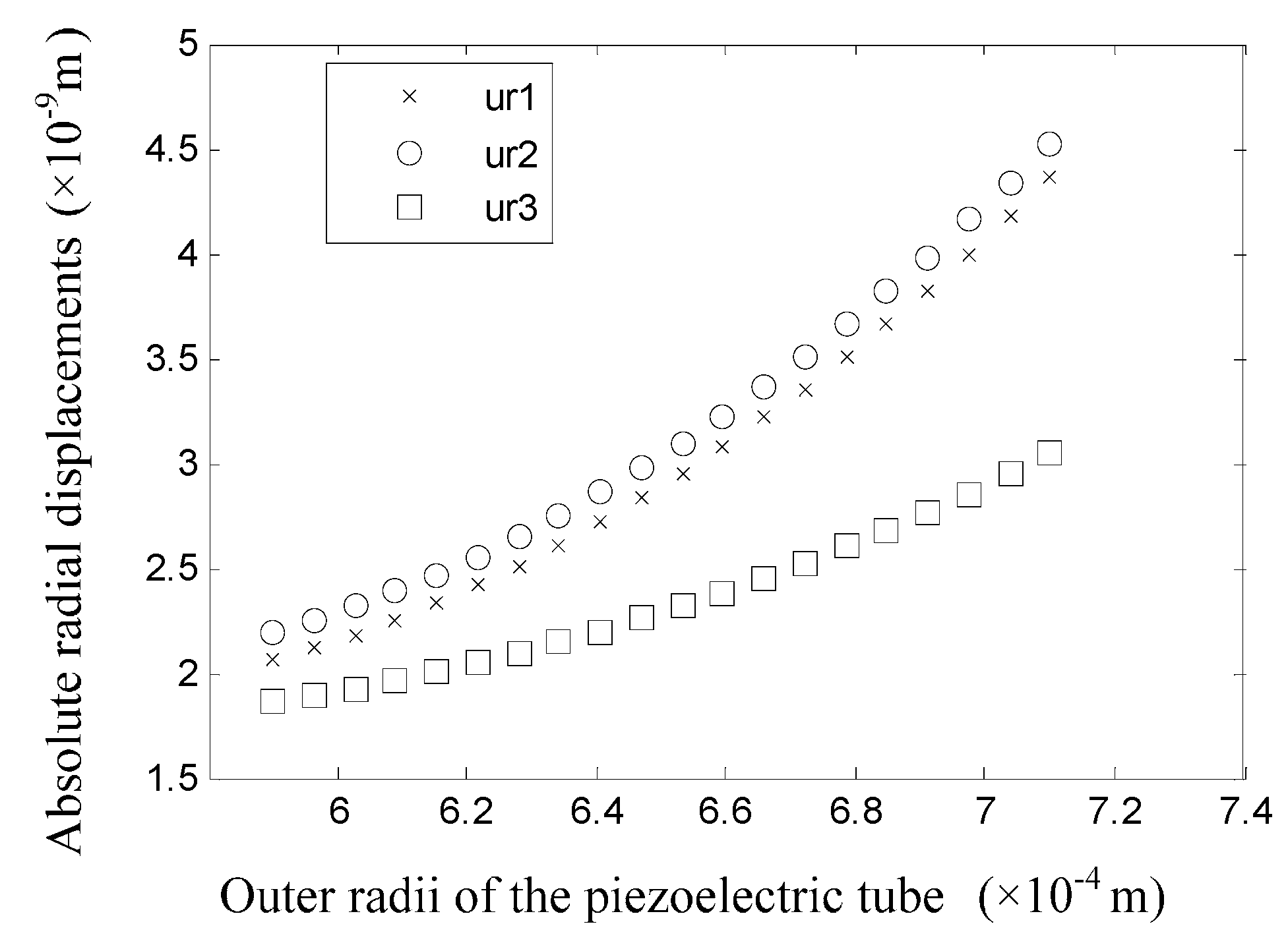 Figure 13 shows the results of the displacements for the tube surfaces when only the value of r 2 is changed, that is, the inner radius of the piezoelectric tube and the outer radius of the glass tube are changed simultaneously. When r 2 is relatively small, in other words, when the glass tube becomes thinner and the piezoelectric tube becomes thicker, all tube walls have a larger displacement. Likely, when r 2 becomes larger, due to insufficient drive and excessive rigidity, the displacements of the tube surfaces become considerably smaller.