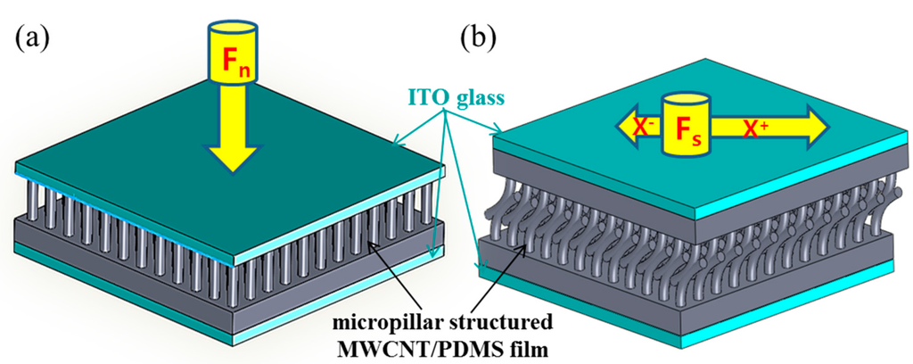 3D schematics of the concept of MWCNT/PDMS tactile sensors; (a) enhancing the sensitivity of a single MWCNT/PDMS film-based tactile sensor with stiff micropillar surface texture under applied normal pressure; (b) directional sensitivity of a double MWCNT/PDMS film-based tactile sensor having interlocked curved-shape micropillars under applied shear pressure (the longer arrow means a larger resistance change under same magnitude of applied shear pressure).