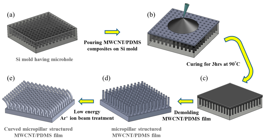 Schematic diagram of the fabrication process for the micropillar structured MWCNT/PDMS film. (a) Si mold having microhole arrays prepared by a photolithography and etching process. The depth of microholes corresponds to the height of micropillars; (b) pouring MWCNT/PDMS solution onto Si mold; (c) curing of MWCNT/PDMS solution on a hot plate at 90 °C for 3 h after removing hexane and entrapped air bubbles; (d) demolding of the cured MWCNT/PDMS film with straight micropillar surface texture; (e) surface modification of micropillar structured MWCNT/PDMS film using Ar+ ion beam irradiation.