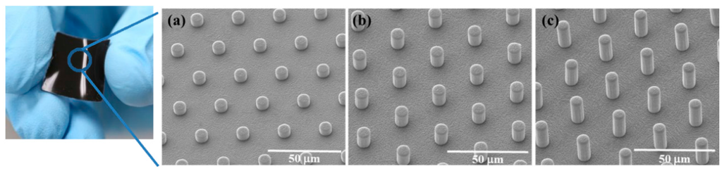 Figure 2 illustrates five steps in the fabrication of MWCNT/PDMS film having straight and curved micropillar surface textures. First, a Si mold with 20 mm × 20 mm dimensions was fabricated through a traditional photolithography and etching process to make microhole arrays of different depths. Then, anti-stiction coating of self-assembly monolayers (SAMs) of trichloro(1H,1H,2H,2H-perfluorooctyl)silane (FOTS) was followed. Coating FOTS SAMs on the Si mold provides hydrophobicity on the Si surface and helps the detachment of the composite film even when MWCNT/PDMS film has high aspect ratio micropillars. An 8 wt.% MWCNT/PDMS composite prepolymer was prepared with MWCNT (Sigma-Aldrich Co. LLC., St. Louis, MO, USA) and PDMS prepolymer (Sylgard® 184, Dow Corning Co., Midland, MI, USA). The composite prepolymer of 650 mg was dissolved in 1 mL of n-hexane (Samchun Pure Chemical Co., Ltd., Pyeongtaek-si, Gyeonggi-do, Korea) and mixed using vortex mixing for 3 min. The composite solution was poured onto the surface of the Si mold. The air bubbles and hexane trapped in the microhole arrays and composite prepolymer itself were removed inside a vacuum desiccator for 30 min. Finally, the nanocomposite solution was cured on a hot plate at 90 °C for 3 h and cured MWCNT/PDMS films were demolded from the Si mold with the surface texture in the form of vertical micropillars (diameter: 5 μm, pitch: 20 μm, height: 5, 10, and 20 μm), as shown in Figure 3. The morphology of the micropillar structured MWCNT/PDMS film was observed using a field emission scanning electron microscope (FESEM, Nova NanoSEM 200, FEI Co., Hillsboro, OR, USA).