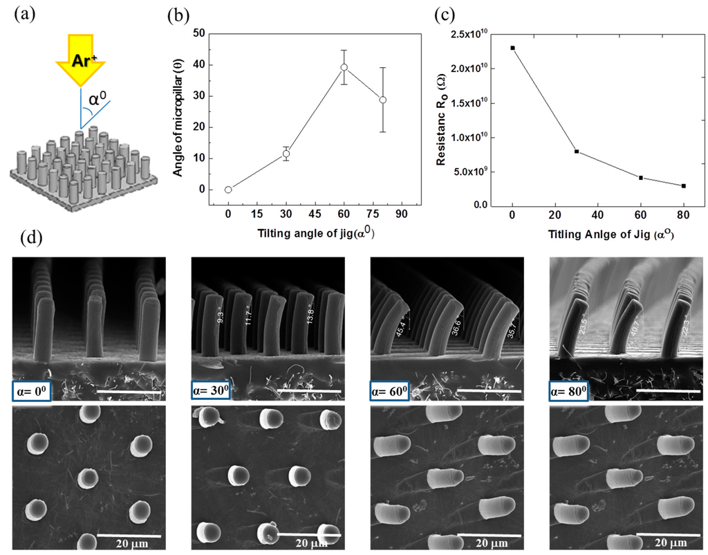 (a) Schematic of Ar+ ion beam irradiation with different incident angles; (b) the angles of curved micropillars according to the incident angles of ion beam irradiation; (c) initial resistances of the curved micropillar structured MWCNT/PDMS films according to the incident angles of ion beam irradiation; (d) FESEM images of the micropillars according to the incident angles of ion beam irradiation at 0°, 30°, 60° and 80° in side view (upper images) and top view (bottom images).