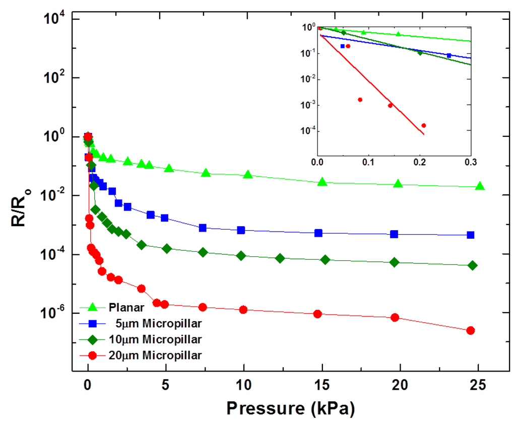 Effect of micropillar height on the sensitivity of the MWCNT/PDMS tactile sensor. The inset shows sensitivities of the developed sensors in the lower pressure regime (<0.3 kPa).