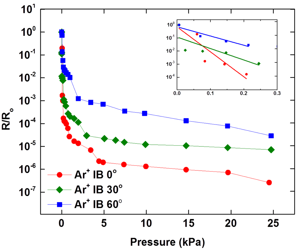 Normal pressure responses of MWCNT/PDMS tactile sensor having 20 μm high micropillars processed by Ar+ ion beam treatment at incident angles of 0°, 30°and 60°. The inset shows the sensitivities of the developed sensors in the lower pressure regime (<0.3 kPa).