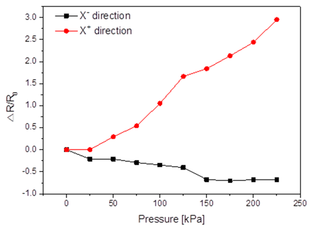 For testing the shear pressure sensing capability, two MWCNT/PDMS films were arranged to have interlocked micropillars. The MWCNT/PDMS tactile sensor with interlocked micropillars was placed between two conductive electrodes in the presence of a normal preload to avoid any slippage during the shear pressure sensing tests. The shear pressures were applied by continuously moving the XY stage in X+ and X− direction at the speed of 10 μm/min and the resistance changes in the tactile sensor were monitored by measuring the resistance between the two electrodes. For shear tactile sensing, each point in Figure 7 is the average of 20 measurements against applied shear pressure. The contact area change of the interlocked micropillars upon applied shear pressure resulted in the resistance change of the proposed MWCNT/PDMS tactile sensor with interlocking curved micropillars. Since the micropillars irradiated at 60° have the maximum curvature, they were deformed easily under a small shear pressure and were three times more sensitive as compared to other types of curved MWCNT/PDMS tactile sensors. These phenomena can be understood because the sidewalls of the micropillars facing the ion gun are completely exposed to the 60° ion beam and the mismatch between the different stiffnesses of the thin layer on the MWCNT/PDMS film surface produces micropillars bending towards the direction of the Ar+ ion beam, so when the shear pressure was applied in the reverse direction of curving of top layer micropillars (X+), the contact area between the interlocked micropillars decreased leading to the increase in the resistance of the tactile sensor, while when the shear pressure was applied in the curving direction of the top layer micropillars (X−), the contact area of the interlocked micropillars increased resulting in a decrease in resistance of the proposed tactile sensor (Figure 7). The developed sensor is able to detect not only magnitude but also differentiate the direction when the applied shear pressure is applied along or opposite to the direction of curvature of the micropillars over the MWCNT/PDMS substrate. The sensing capabilities of the proposed tactile sensor can be further extended for the realization of tactile sensing mechanisms for prosthetic arms or legs, touch panels, wearable artificial skins, etc.