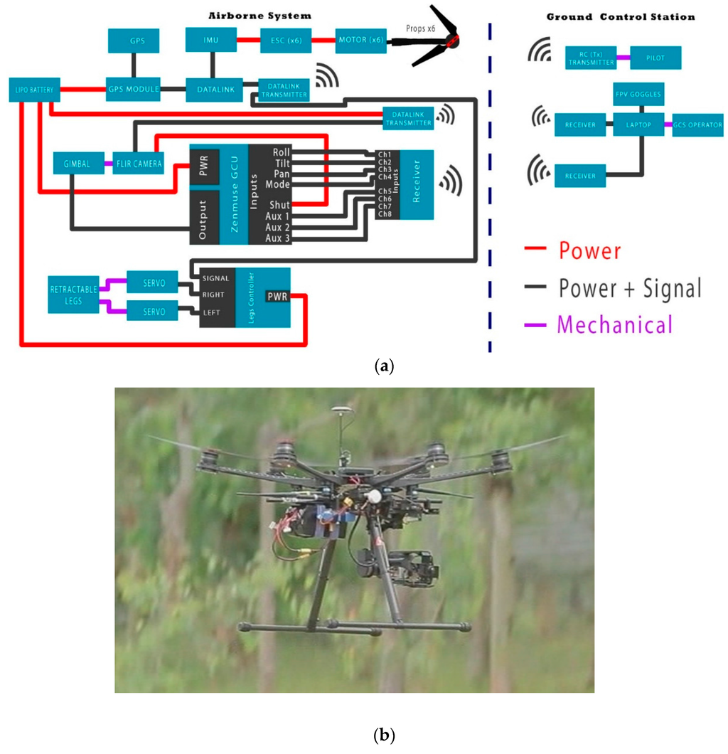 (a) System Architecture consisting of airborne and ground control segments and (b) Multirotor UAV, thermal camera, gimbal system and video transmitter.