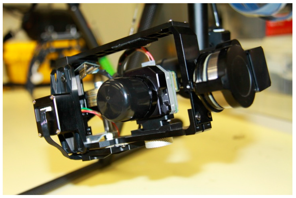 The FLIR camera used is a Tau 2-640 [], Figure 2. The camera weighs 100 g and has a 640 × 480 pixels resolution and 25 mm focal lens. The FLIR has a field of view of 25 × 22 degrees. The FLIR video can be sent to the ground via AVL58 5.8 GHz Video Link which comprises a receiver in the laptop and an airborne transmitter. The video received by the laptop is recorded with off-the-shelf video recording software. The sampling frequency of the thermal camera is 9 fps and the sensitivity (NEdT) is <50 mK at f/1.0. The scene range (high gain) is −25° to +135° and the low gain is −40° to +550°. The camera is capable of operating at altitudes up to +40,000 ft and has an operating temperature of −40 °C to +80 °C []. A gimbal system is used to hold the camera as shown in Figure 2, stabilize the video signal and dampen the vibrations of the frame. The gimbal control commands are received by the receiver attached to the Zenmuse Gimbal Control Unit (GCU). This allows the pilot or UAV controller to change the roll, pitch, pan and mode of the gimbal, and to control the FLIR camera.