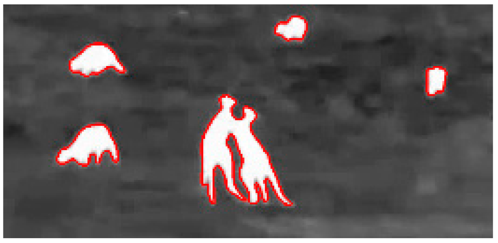 As seen in Figure 7, after applying first the erosion operation and then the dilation, the PIT algorithm is able to separate the kangaroos into two different objects. The third step is to search for the object of interest in the resulting image. Defining a minimum and maximum size threshold (Figure 5, slide 2 and 3) the algorithm searches for clusters of white pixels within the range and groups them to then display and count the clusters. The minimum and maximum size is a function of the number of pixels in the objects of interest. Every threshold value described in this algorithm may be changed during video processing to accommodate changing external conditions such as light, environmental temperature and video quality. The GUI provides slides to adjust the values and fine-tune the final processing.