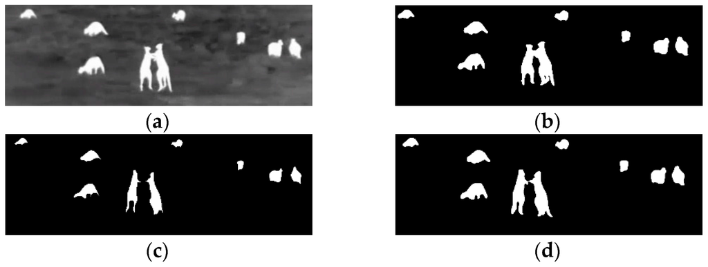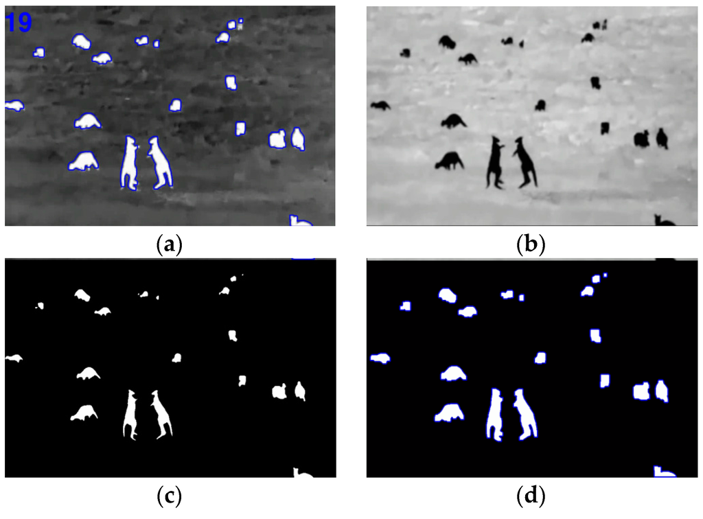 (a) Result footage for kangaroos (b) Image inverted (c) Erode operation (d) Dilation and group.
