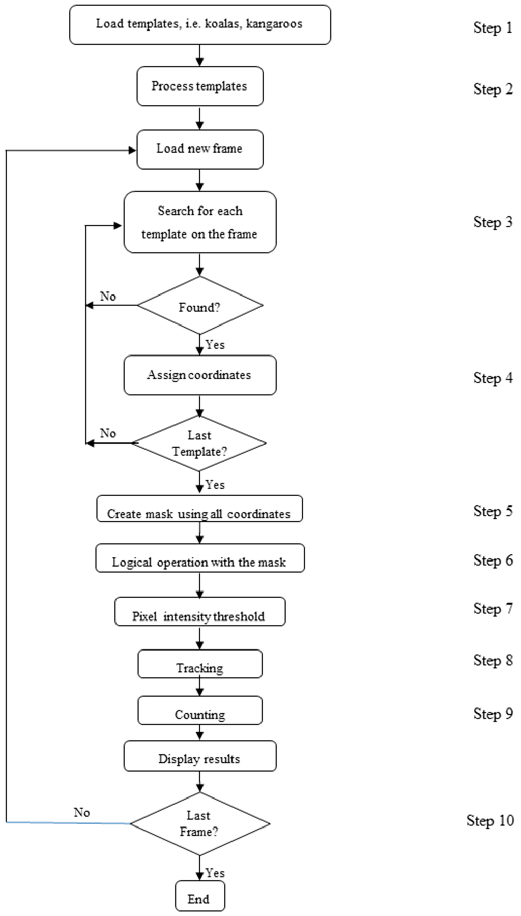 - Load templates: In this first step template images are selected (e.g., koala, kangaroo, deer, pigs or birds). The templates are taken from the original footage or a database of images and then saved as small images of the object of interest. The algorithm is able to search for multiple templates in each frame.