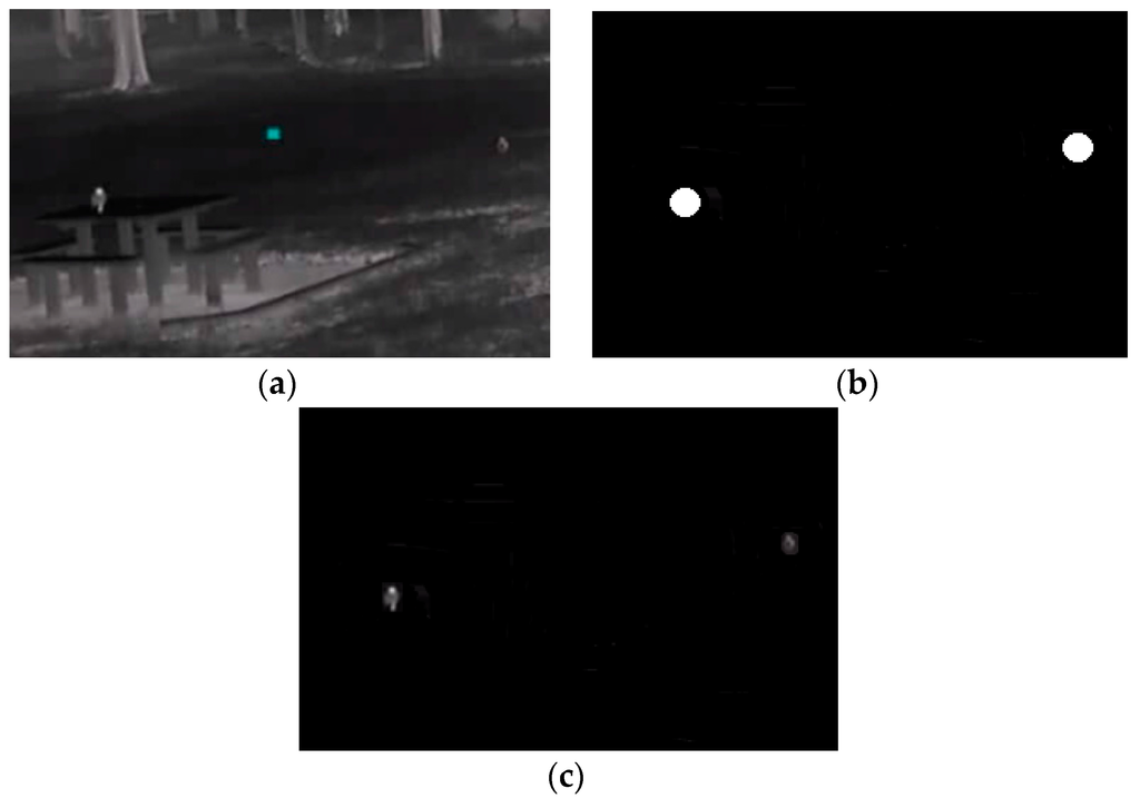 (a) Original footage (b) Mask created using the target’s coordinates (birds) (c) Image result eliminating the background.