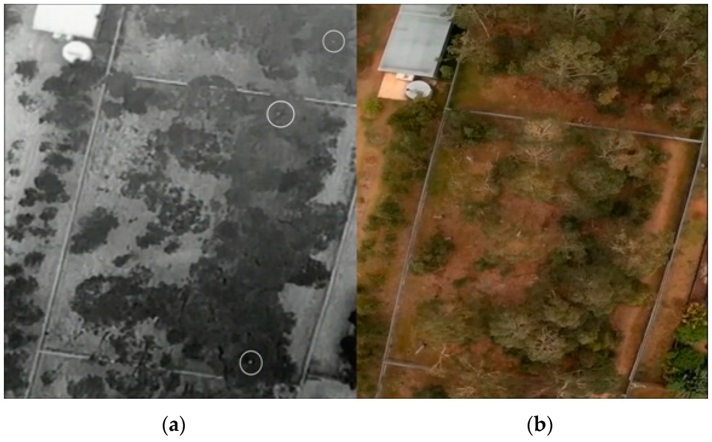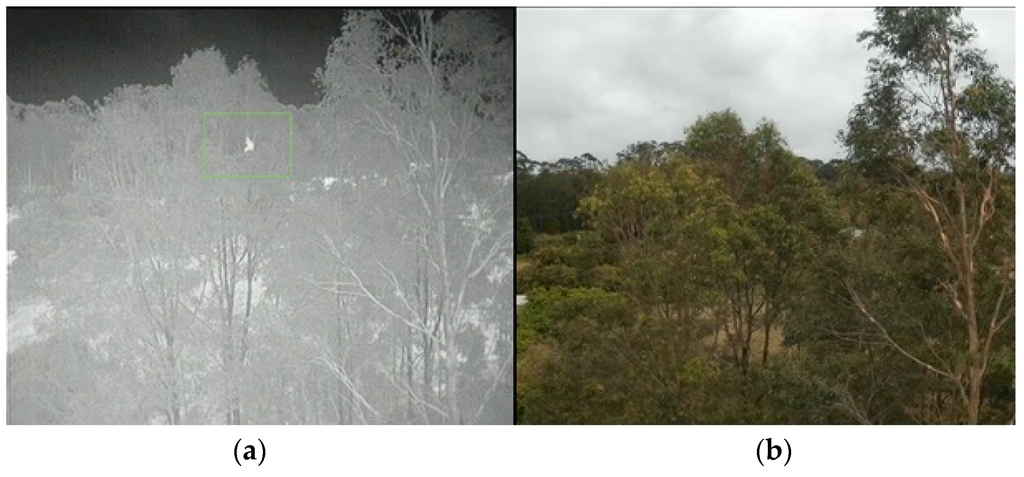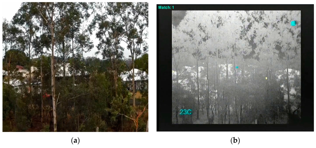 The detection algorithms described in Section 2.2.1 and Section 2.2.2 were applied post-flight on the recorded imagery. The test flights successfully located koalas of different shapes and sizes. Figure 16a,b are examples of results at a height of 60 m. Figure 16a is a greyscale image with thermal imagery tracking. Figure 16b is a digital image of the same view illustrating the difficulty of visually spotting the koala. Similarly, Figure 13a,b show a greyscale thermal image of a koala identified alongside the real world image from a lateral perspective.