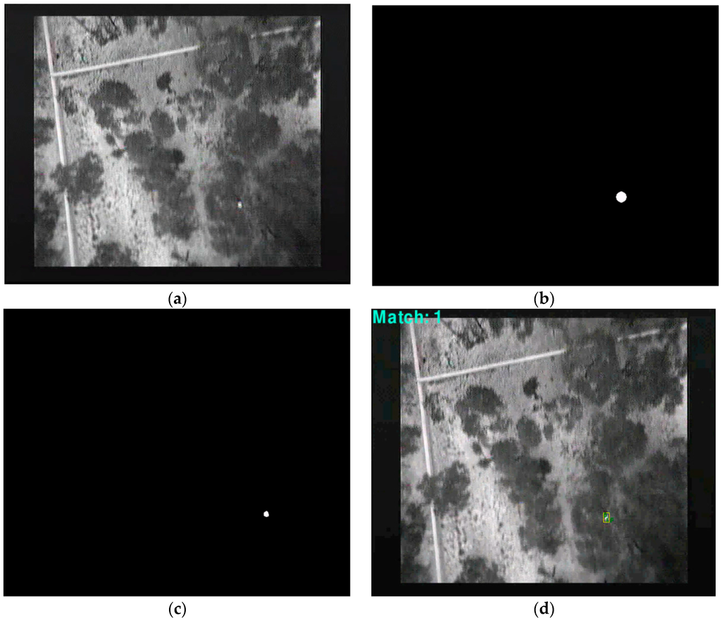 - Create a mask using coordinates: A new image is created with the same dimension as the source footage with a black (pixel with a value of 0) background. Using the coordinates within the image of the match found in the previous step, a white (pixel with a value of 255) bounding box or circle is drawn with a variable area (Figure 11b). The size of this area is defined by calculating the area of the match. The mask image aims to reduce the search area, eliminating what is considered as background.