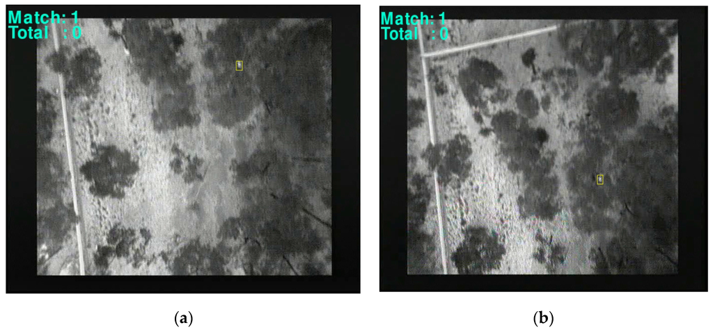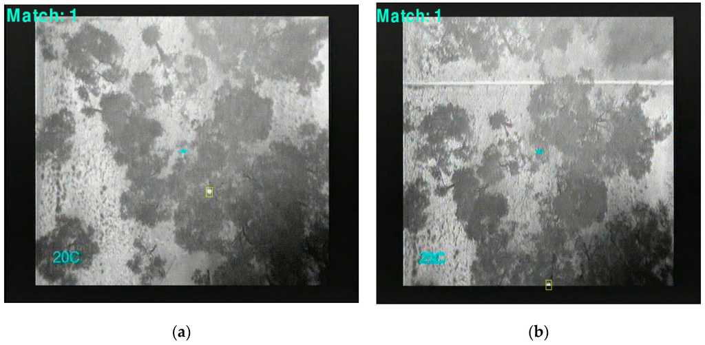 Figure 15 shows an example of an image from footage obtained at 80 m where a thermal signature (e.g., koala) has been detected while searching above the canopy. We found that at this distance, and at heights greater than 60 m, confirming the detection of a particular thermal signature is difficult but this is also highly dependent on the camera characteristics and settings as well as the thermal differential between the target and other objects. Moreover, we found it challenging to distinguish between thermal signatures of different species, due to the lower resolution and difference in target object size relative to the image size. Consequently flying at such heights can feasibly result in false positives. The TMBM algorithm was tested on footage taken while flying at a height lower than 60 m.