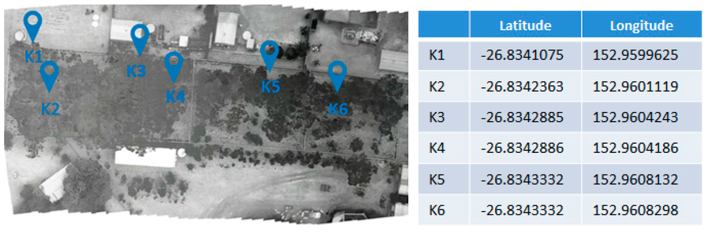 In order to evaluate the accuracy of detection, the GPS locations of the detected koalas (Figure 20) were compared with counts obtained by people on the ground. Even though in some cases a single koala was difficult to locate, the vertical traveling of the UAV above the canopy gave the camera a new angle of vision, locating the koala in almost all cases. We filtered all the false positives as described in Section 3, Steps 1 to 5, giving a clean and accurate result. This comparison can be seen in Table 2. Average detection times were defined as the time since the koala was first detected until the algorithm was able to mark it as a “real” match. These were recorded by the algorithm to determine the optimal altitude of detection. As the sampling frequency of the thermal camera is 9 fps, all detections were made in over one second changing as the altitude increases.