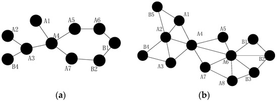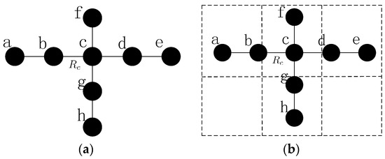 Nevertheless, the failed node may not be a cut-vertex (Case 2 for short), as shown in Figure 1a,b. The failure of node will not affect the network connectivity, but the path length of node and is significantly longer than it was before the failure (from 2 hops to 6 hops), which may cause unnecessary energy consumption. Moreover, many other nodes become cut-vertices due to the failure of node , such as nodes , , etc. As we all know, the load of the paths that contain cut-vertices may be extremely high. The cut-vertices in these paths may consume much more energy than other nodes, and the whole network may be disconnected in a short time. In addition, the traffic interference of the paths will be catastrophic, the communications may be difficult and the network will not be able to work successfully. Similarly, when node fails in Figure 1a, all of its neighbors can still communicate with each other, but the shortest path has changed. Thus, it is also important to solve this problem and not only the cut-vertex failure.