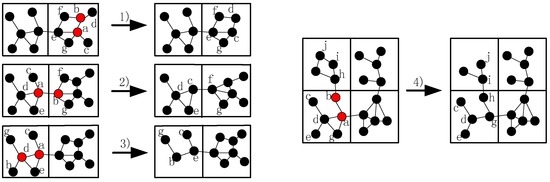 As shown in Figure 1a,b, when node fails, the shortest path between its neighbors increased, so it is necessary to decrease the increment. Since the shortest path between node and is the longest among all the others after failure, CSFR may choose node and as a pair of source and destination nodes when establishing the CC-link. Figure 2a,b shows two cases of single cut-vertex failure, when the network is divided into disconnected regions after node fails. In Figure 2a, there are four blocks after the failure. Node , , and will select themselves as the pair of source and destination nodes based on the information of 2-hop neighbors. According to Equations (4) and (5), the two nearest nodes are chosen as source and destination nodes, for example, node and . Thus, node and will establish connecting path via cooperative communication firstly, the block contains node and the block contains node will be referred to as a group after the collaboration. Then, there are three disconnected blocks and the recovery process continues, the second nearest nodes in the different blocks will be selected as source and destination nodes, and the process goes on until the network is connected.