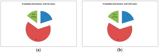 Upon deploying, the influence of each node on the network connectivity is different. Since this paper focuses on the restoration of any kind of node failure(s), it is important to make the components of the network clear. Figure 9a,b show the probability distribution of categories that the nodes may belong to after deployment (the communication range is set as 100 m). The nodes with node connectivity materiality are classified into Category ; the nodes with node connectivity materiality are Category ; and the nodes with node connectivity materiality are cut-vertices. As can be seen in the Figure 9a,b, it is necessary to handle the node failures in Category as there are many of them in the network.
