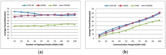 Figure 11a indicates the impact of varying DN values for the network, while all the nodes are equipped with the uniform communication range . Small DN makes the CSFR-M a little poor than others in the performance of average travel distance, but the maximum probability of restoring the connectivity with node movement when is around 14% as shown in Figure 10a. With the increase of DN, the performance of CSFR-M is as good as DARA and PADRA. Considering comprehensively the performance of CSFR-M in terms of average travel distance is better than DARA and PADRA algorithms. The average travel distance of RIM is the smallest since the biggest movement distance of RIM is limited to . Apparently, the average travel distance will increase as becomes larger, as we can see in Figure 11b. In a word, CSFR-M is better than DARA and PADRA comprehensively in the performance of average travel distance of each node.