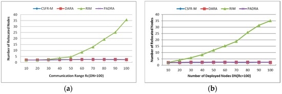 The average number of relocated nodes during the restoration with different and DN is shown in Figure 12a,b. As mentioned earlier, the plotted results are the average over multiple independent simulations. The two figures indicate that CSFR-M, DARA and PADRA need almost the same nodes in the recovery, and the number of reposition nodes is fewer than RIM since RIM requires all neighbors of the failed node to move. Obviously, the number of relocated nodes in RIM will increase when the values of and DN grow because the number of neighbors of each node increases. However, the number of relocated nodes almost remains unchanged with different and DN. This will contribute to the candidate selection measure. Since the node with the minimum number of 1-hop neighbors is preferred, the number of relocated nodes will always be minimum with different and DN.