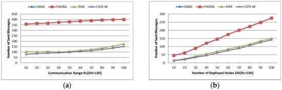 As shown in Figure 13a,b, the curve of DARA and PADRA overlap with each other as they send almost the same number of messages during the restoration. The number of sent messages of CSFR-M during the restoration is a little bit less than that of RIM, but CSFR-M introduces significantly less messaging overhead in comparison of DARA and PADRA. RIM is better in the performance of this parameter because it needs 1-hop neighbor information, rather than the 2-hop neighbor information required in DARA and PADRA. Since CSFR-M only sends messages to inform the establishment of CC-link or the necessary of node movements, the messages are transmitted among a few involved nodes and the number should be small. Both figures also indicate that when the network becomes more connected, i.e., larger or DN, the message traffic grows. This can be attributed to the increased number of neighbors that must be notified before CC-link is built or relocation takes place. It is worth noting that DARA and PADRA use the same number of messages and their curves totally overlap. Considering the previous simulation results comprehensively, the CSFR-M is still an efficient and favorable approach.