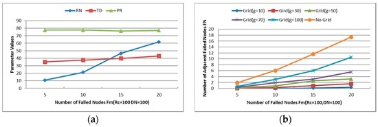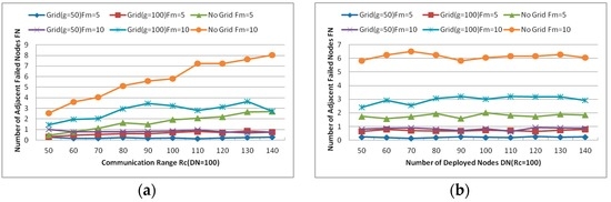Figure 15a indicates that the number of adjacent failed nodes increases significantly without gridding in both cases (i.e., Fm = 5 and 10) when the communication range of each node varies from 30 to 140 m. However, the values of FN with gridding in both cases maintain around some fixed values. Similarly, all values of FN maintain around some fixed values in both cases, as can be seen in Figure 15b. Deliberating the results of these simulations, the values of FN are found to have smaller fluctuations with the smaller grid size when other parameters are the same. Thus, we can image how small the values of FN could be when the grid size is set under 50. However, as we can see from the simulation results, the value of FN is less than or equal to 1 when the grid size with different and DN. Moreover, when the grid size is excessively small, too many empty grids that do not contain any nodes will cause unnecessary troubles during the recovery process. Certainly, the computation due to gridding will be more complex when the grid size is excessively small. Hence, the grid size will be set as 50 m in the following simulations after considering the previous analysis comprehensively and cautiously.